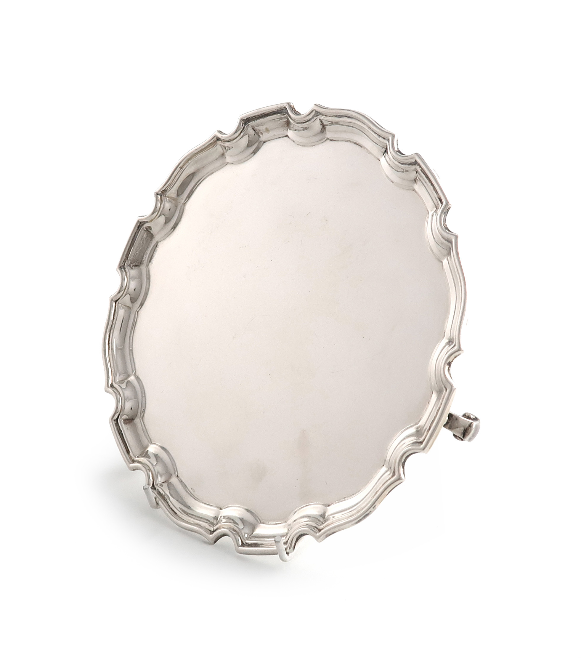 circular form, moulded border, on three gnarl feet, diameter 20.5cm, approx. weight 11oz.