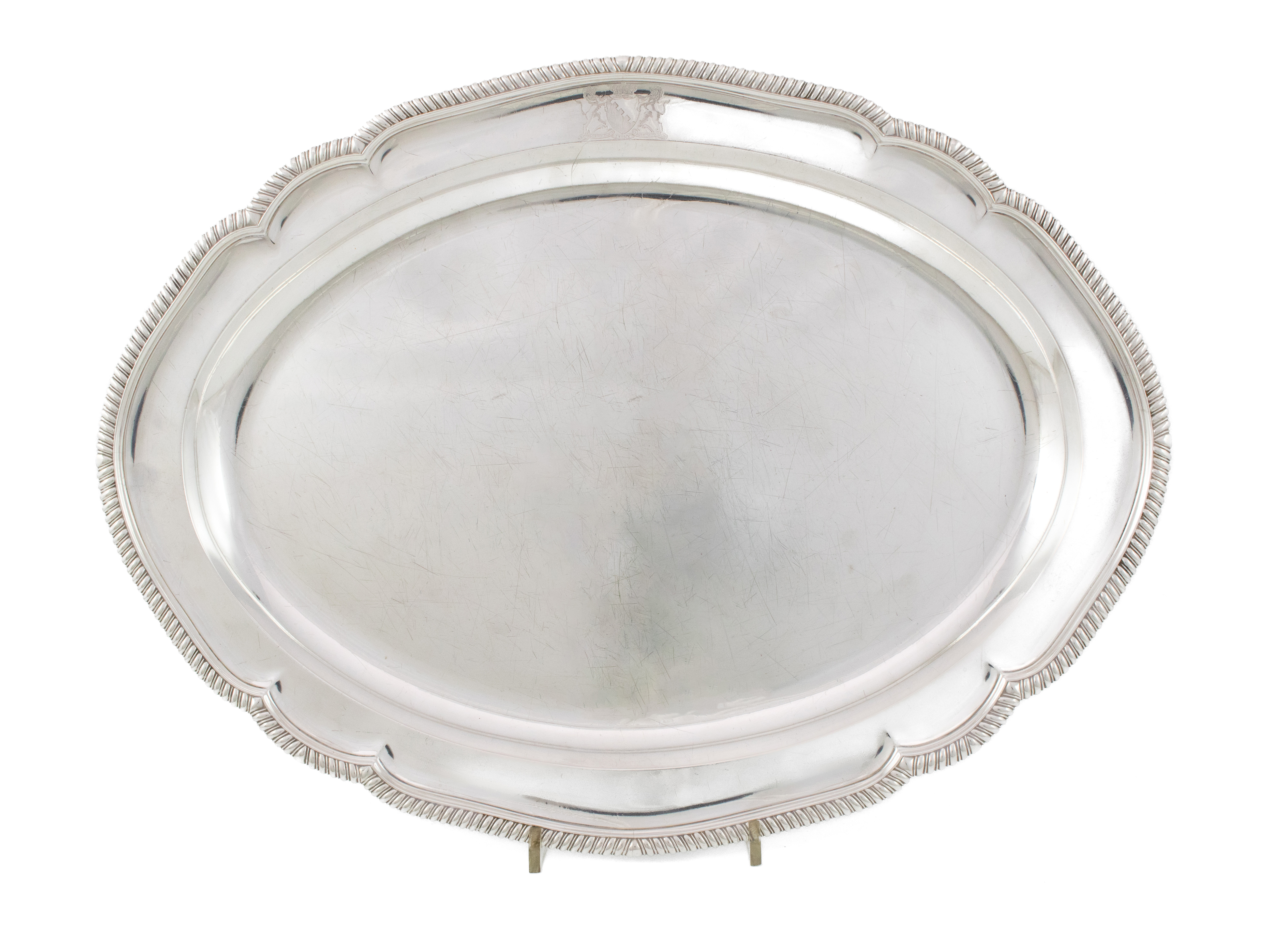 oval form, gadroon border, engraved armorial, length 46.2cm, approx. weight 60.9oz.