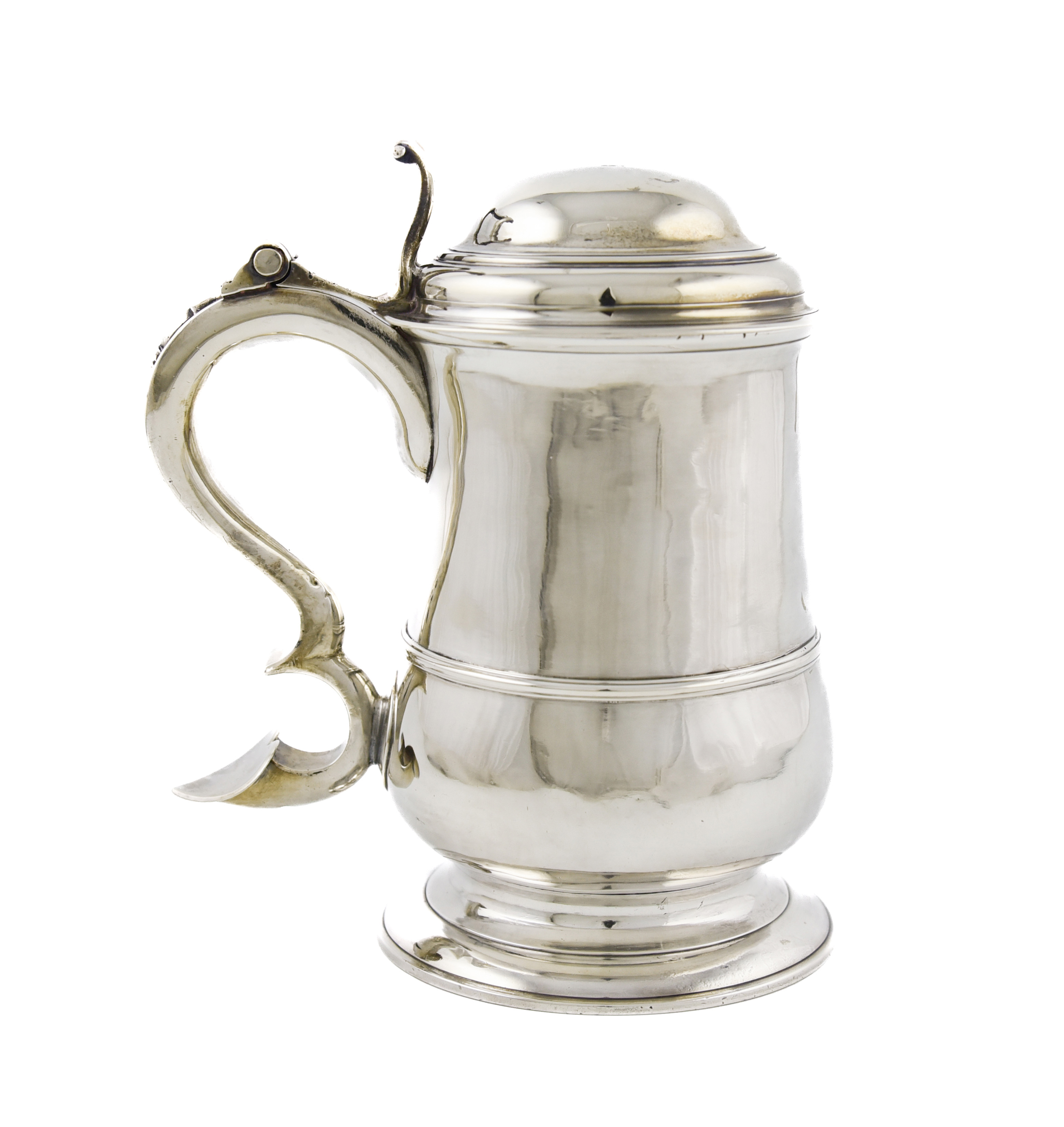 baluster form, scroll handle with a heart-shaped terminal, domed hinged cover with a pierced thumb-piece, on a circular foot, height 18.5cm, approx. weight 22.9oz.