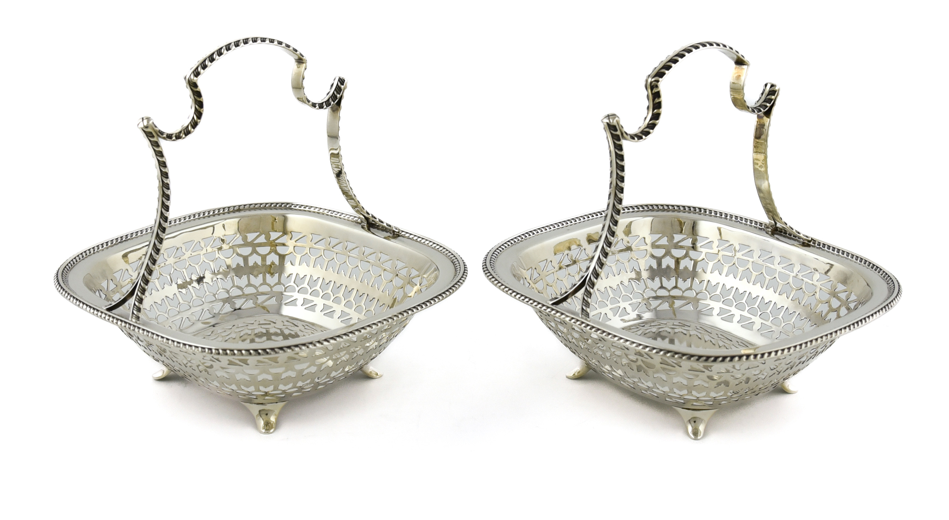 rounded square form, pierced decoration, gadroon borders and central handle, on four bracket feet, length 17.8cm, approx. weight 19oz. (2)