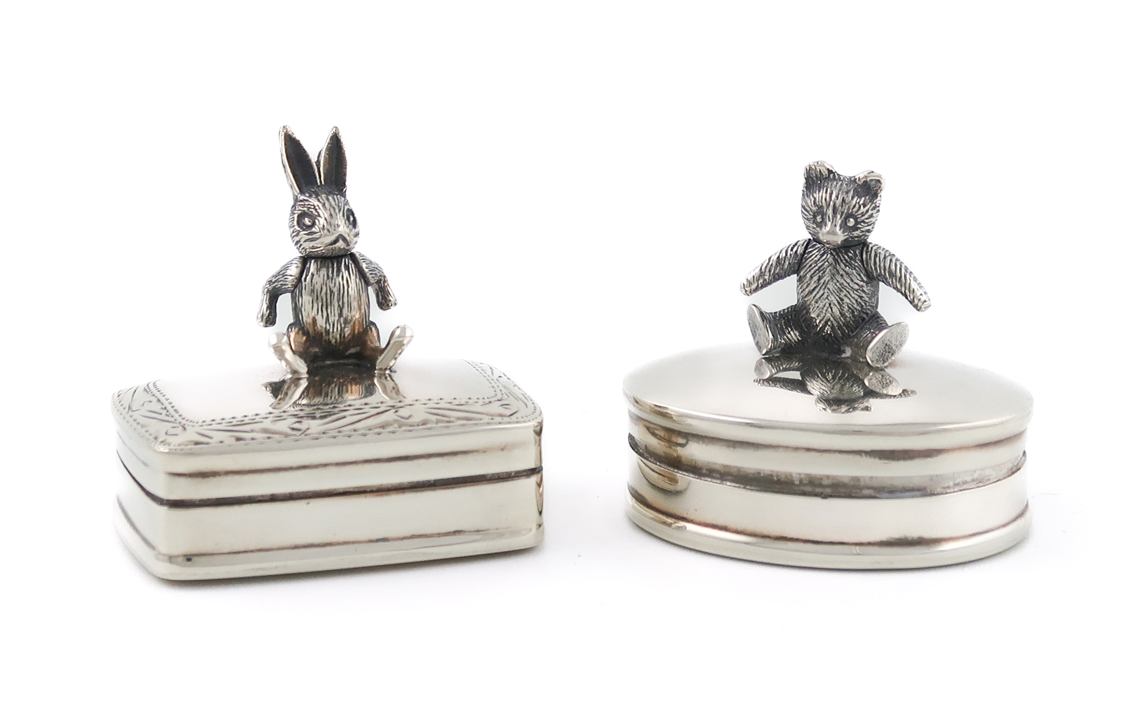 oval and rectangular form, the covers mounted with a teddy bear and a rabbit, length 3.6cm, approx. weight 1.1oz. (2)