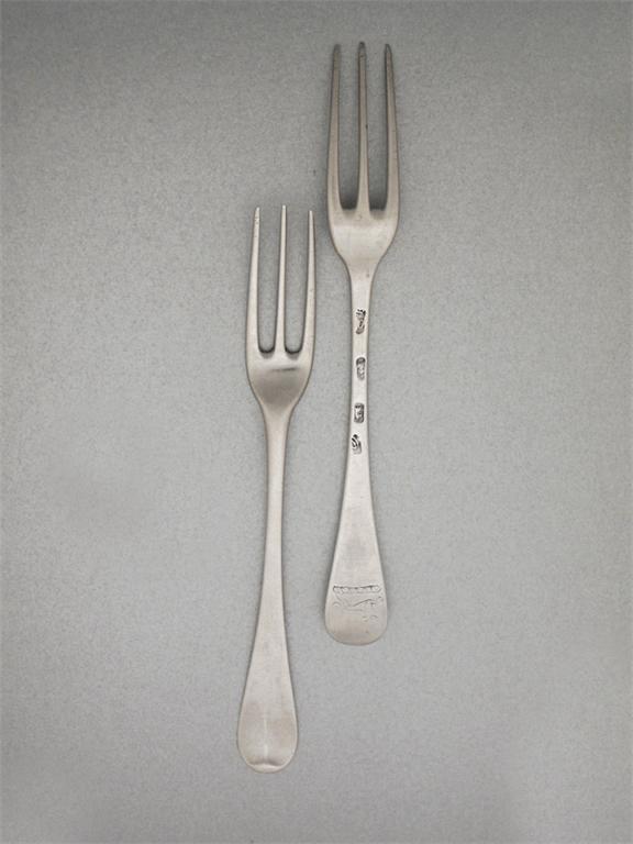 A set of six Queen Anne three prong dessert forks, leaping greyhound crest, maker Lawrence Jones, London, 1713, 7.5oz. (6)