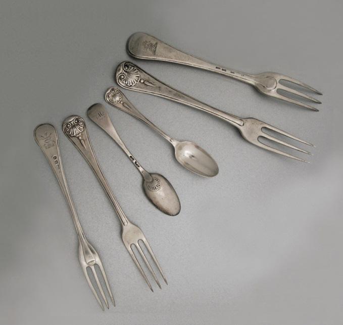 A matched part canteen of three-prong Hanoverian thread shell and drop pattern flatware comprising: a set of fifteen George II table forks, crested, makers Isaac Callard, London 1749, a set of seven George III dessert forks, maker John Mewburn, London 1805, a set of five George II dessert forks, no maker's mark, London 1754, a single unmarked dessert fork, a set of six shell back tea spoons, maker Elias Cachart, London 1745, and a salt shovel by the same maker, London 1740, various crests and initials, 57oz. (35)