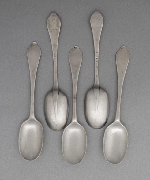 A set of five Queen Anne tablespoons, with plain moulded rattails, crested, maker Isaac Davenport, London 1705, 9.25oz. (5)