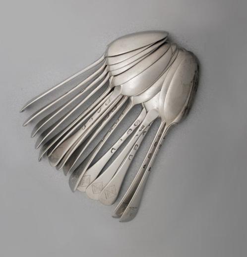 Sixteen George I dessert spoons, including a matched set of twelve, with single drops and revised rib on the front of the stem and an engraved lozenge on the reverse, maker John Hopkins, London 1724 (one with maker's mark struck three times only), together with a set of four similar dessert spoons, with plain rattails, crested, maker Joseph Barbent, London 1719, 24oz. (16)