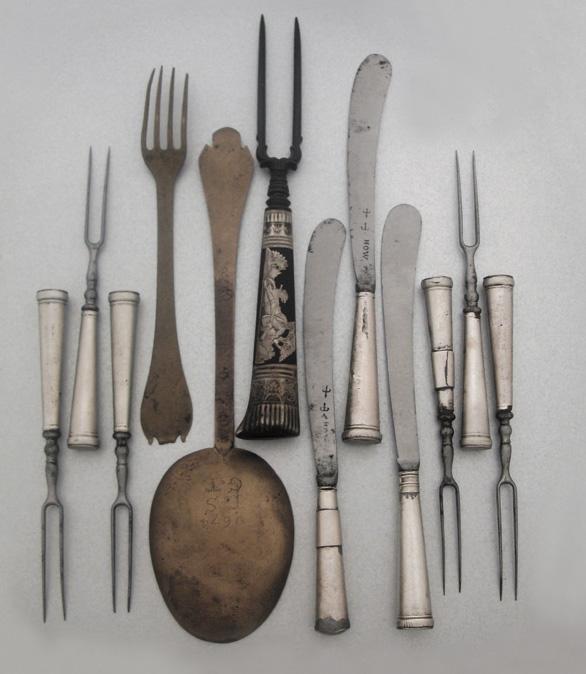 A mixed lot comprising: five early 18th century steel two-prong dessert forks, with seal end, cannon handles and three matching knives together with a continental steel two prong fork with a silver mounted tortoiseshell handle, with a sportsman and dog, a later trefid spoon. (12)