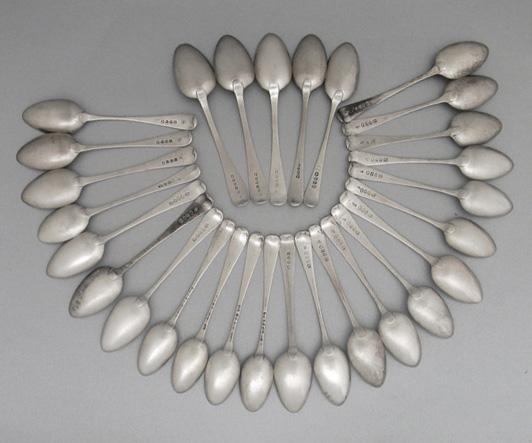 Twenty seven Old English pattern dessert spoons, including seven with a lozenge shield armorial, maker Richard Crossley, London 1794 and twenty other varying George III examples (including one by Joseph Hicks of Exeter), 28oz. (27)