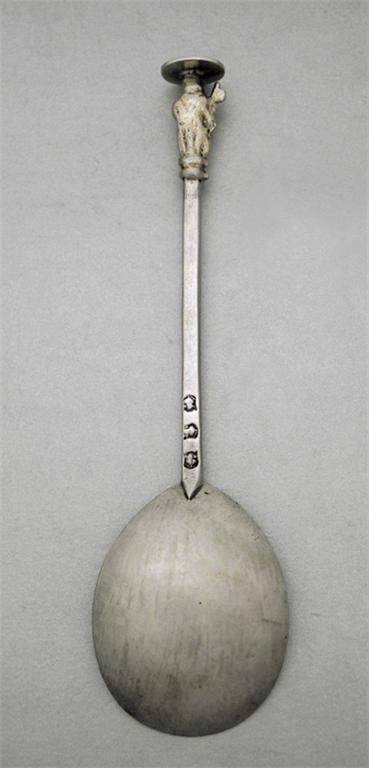 Unascribed West Country: A Charles I spoon, the gilt figure of St.Peter with a large nimbus, pricked E.F over 1682 over I.H, struck four times on the stem and once in the bowl, with an acorn, c.1640, 7.55in (19.2cm). For these marks see Jackson's Revised, p.521 as seen on a spoon, c.1640
