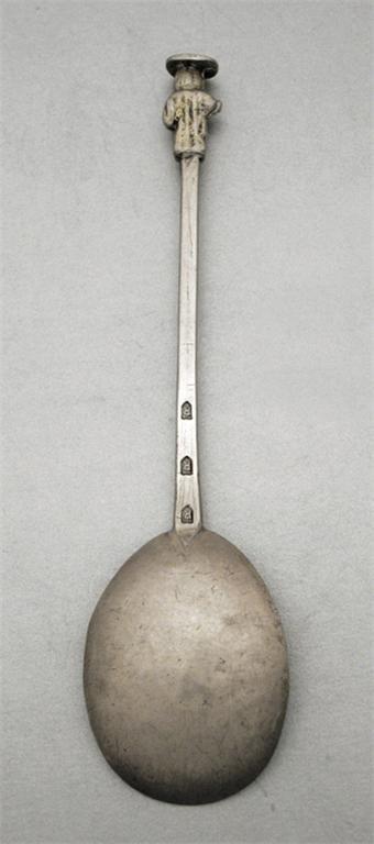 Unascribed: A Charles I spoon, the gilt figure without emblem, with a plain nimbus pricked E.S over 1662 over M.D struck once in the bowl and thrice on the stem, c.1640, 7.5in (19cm). For the marks see Jackson's Revised, p.518 as noted on a seal-top spoon, c.1640 and previously ascribed to Rochester