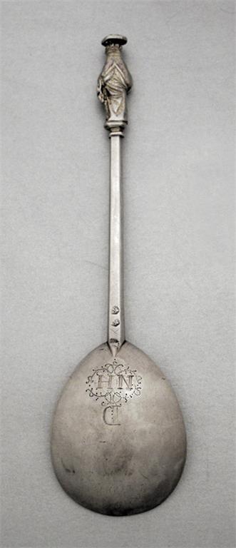 Bristol: A fine Elizabeth I spoon, the large gilt figure of St Paul, with a pierced spoked nimbus and a sword, scratched on the back of the bowl D over NH, within scroll prickwork, struck once in the bowl with a quatrefoil and twice on the stem with a maker's mark Tg over a fleur de lys, possibly for Thomas Goodyear, c.1590, 7.25in (18.3cm). See Kent, West Country spoons and their makers, pp.92 and 93, also 97 for details of Richard Harsell, Bristol Goldsmith and Apprentice of Thomas Goodyear, where it notes his use of a quatrefoil mark in the bowl of a Maidenhead spoon