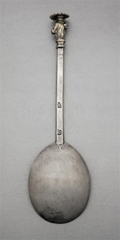 Salisbury: A Charles II spoon, the gilt figure lacking emblems with a large polyfoil nimbus, pricked R.W over 1673 over I.G, struck once in the bowl with maker's mark T and mis-struck twice on the stem with a variation of the maker's mark TT of Thomas Thornburgh, c.1673, 7.7in (19.5cm). As a point of interest, Thomas Thornburgh was buried in St Thomas's church, Salisbury on the 24th November 1673