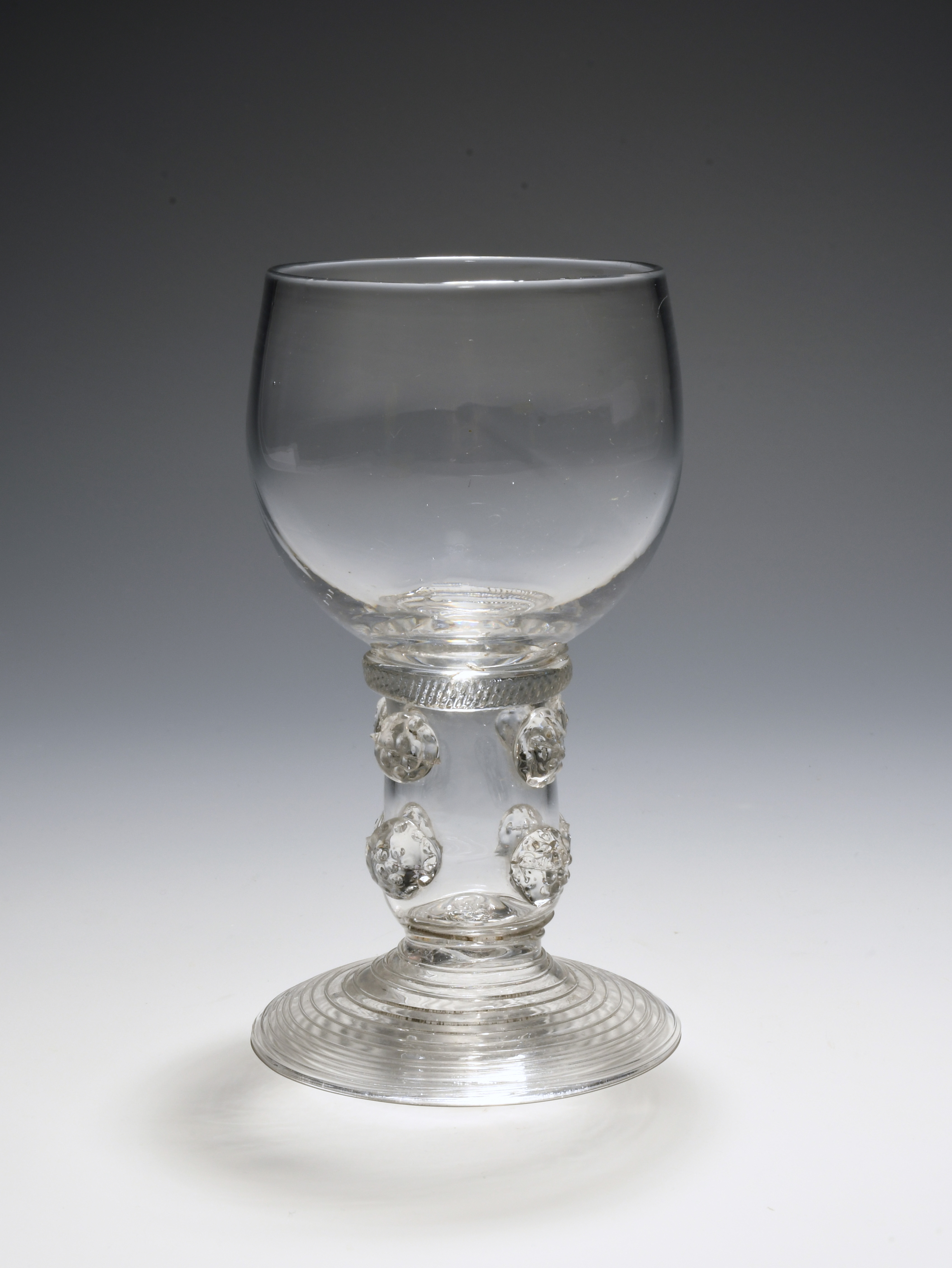 An English glass roemer for the export market, 18th century, the cup bowl raised on a thick hollow stem applied with raspberry prunts, over a tall conical foot with trailed decoration, 13cm.