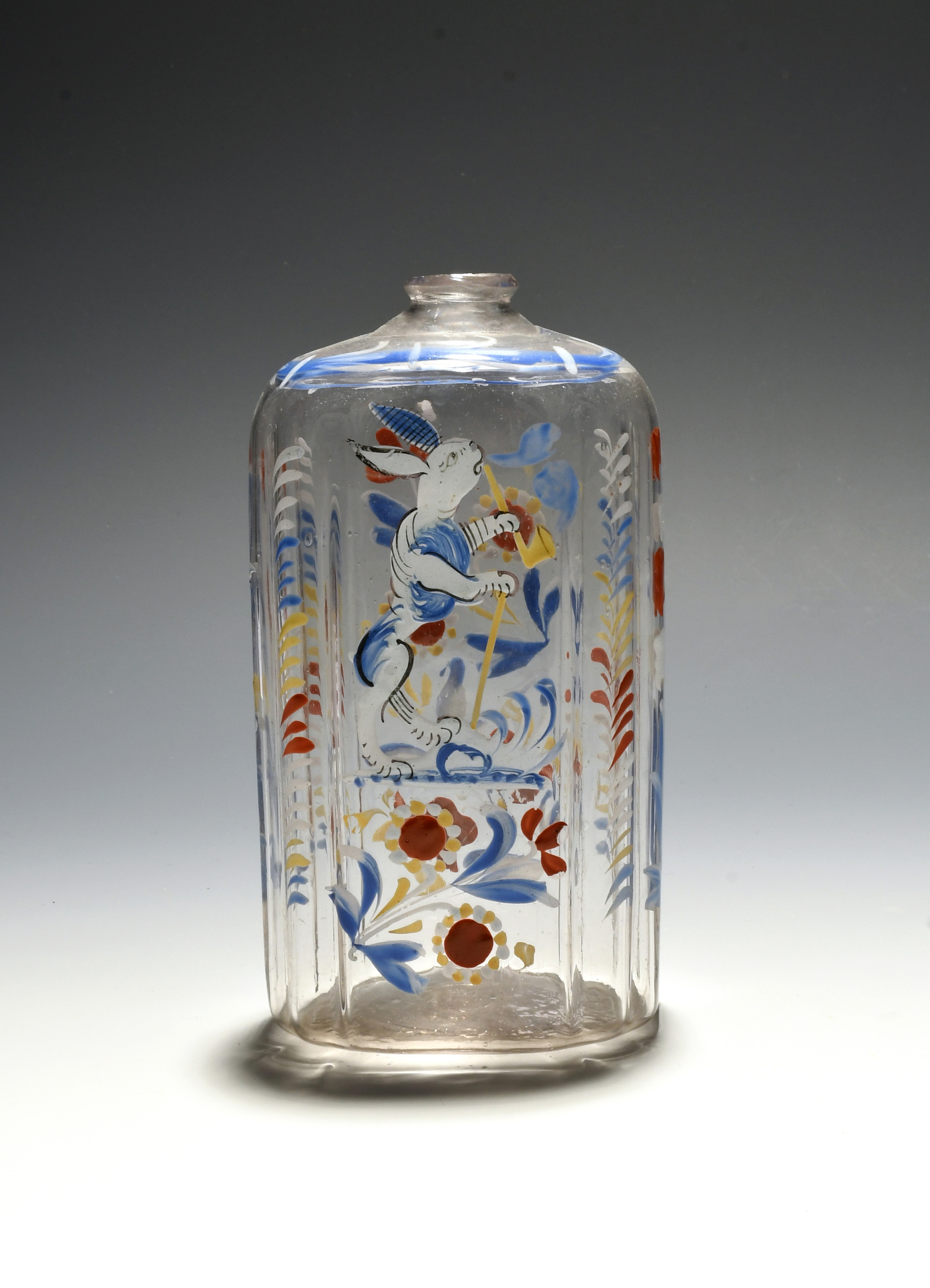 A German enamelled glass flask, 18th century, painted with a white rabbit or hare smoking a