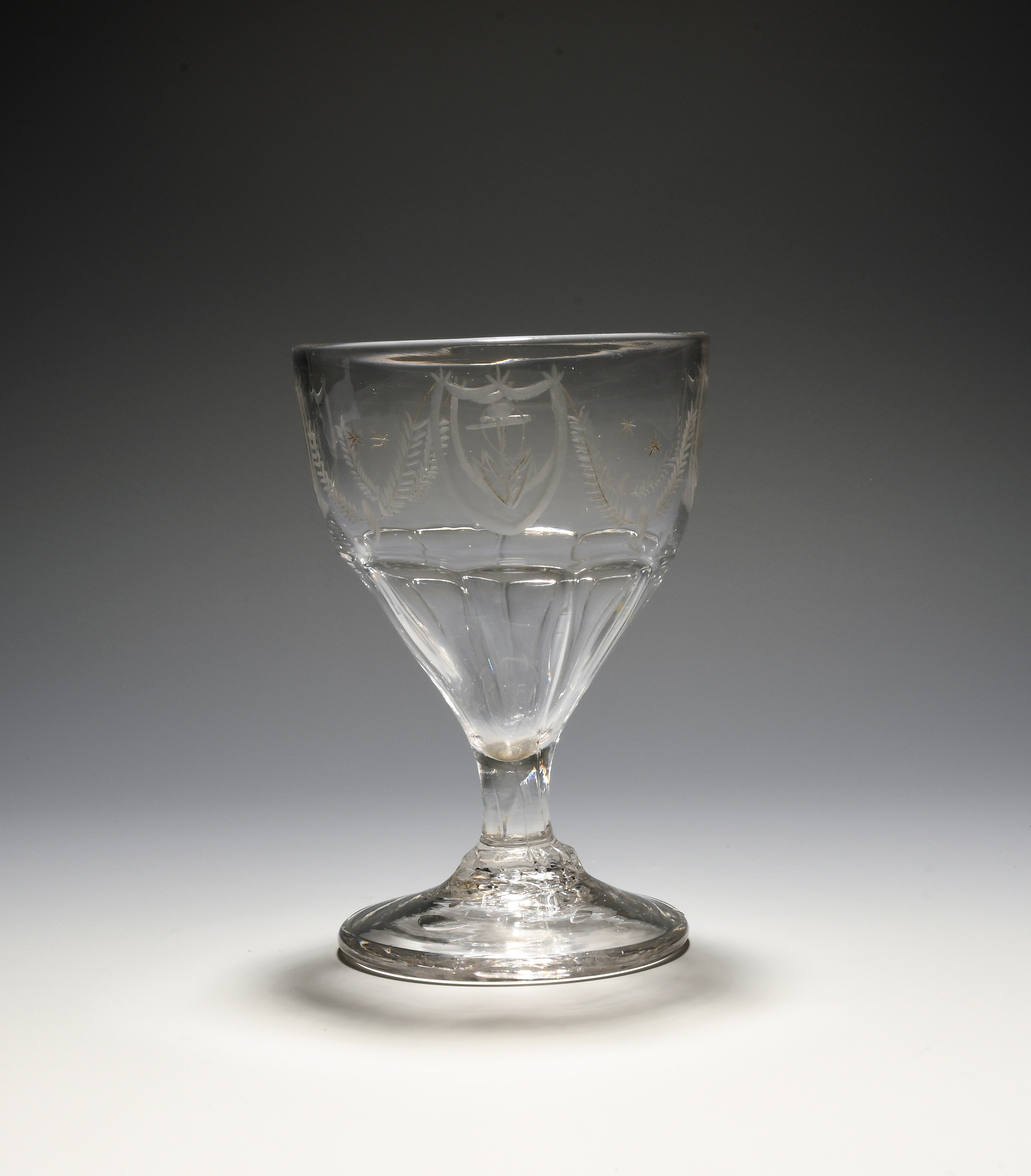 A small glass rummer of naval interest, late 18th/early 19th century, moulded with lappets rising from a short plain stem, the bowl engraved with shield panels containing sailing boats and spoiled anchors, linked by laurel leaf swags, 12cm.