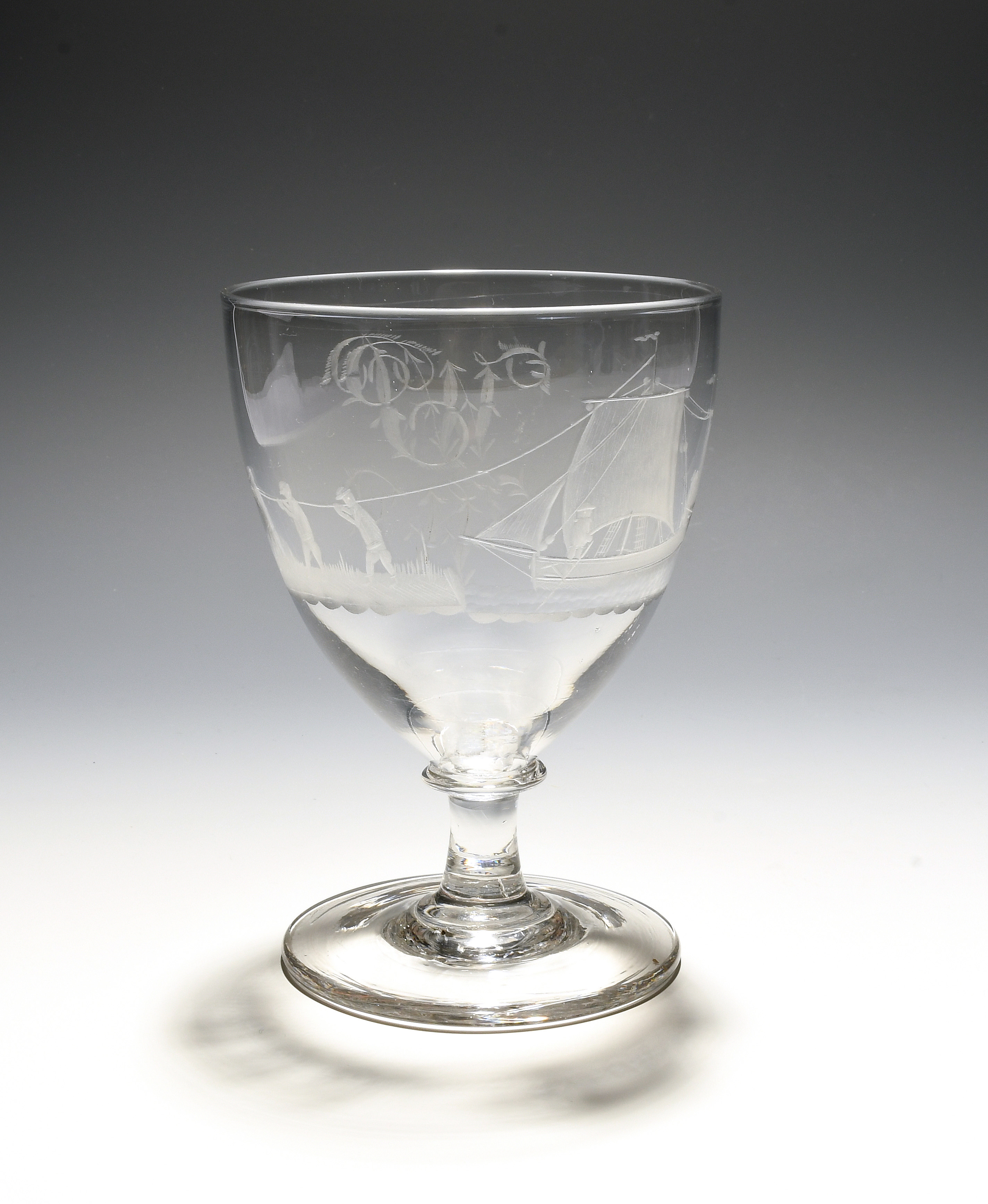 An engraved glass rummer, early 19th century, the deep funnel bowl engraved with an unusual scene of three men hauling on a rope to tow a small sailing boat with two further figures aboard, the reverse with the initials WPW, 15.5cm.