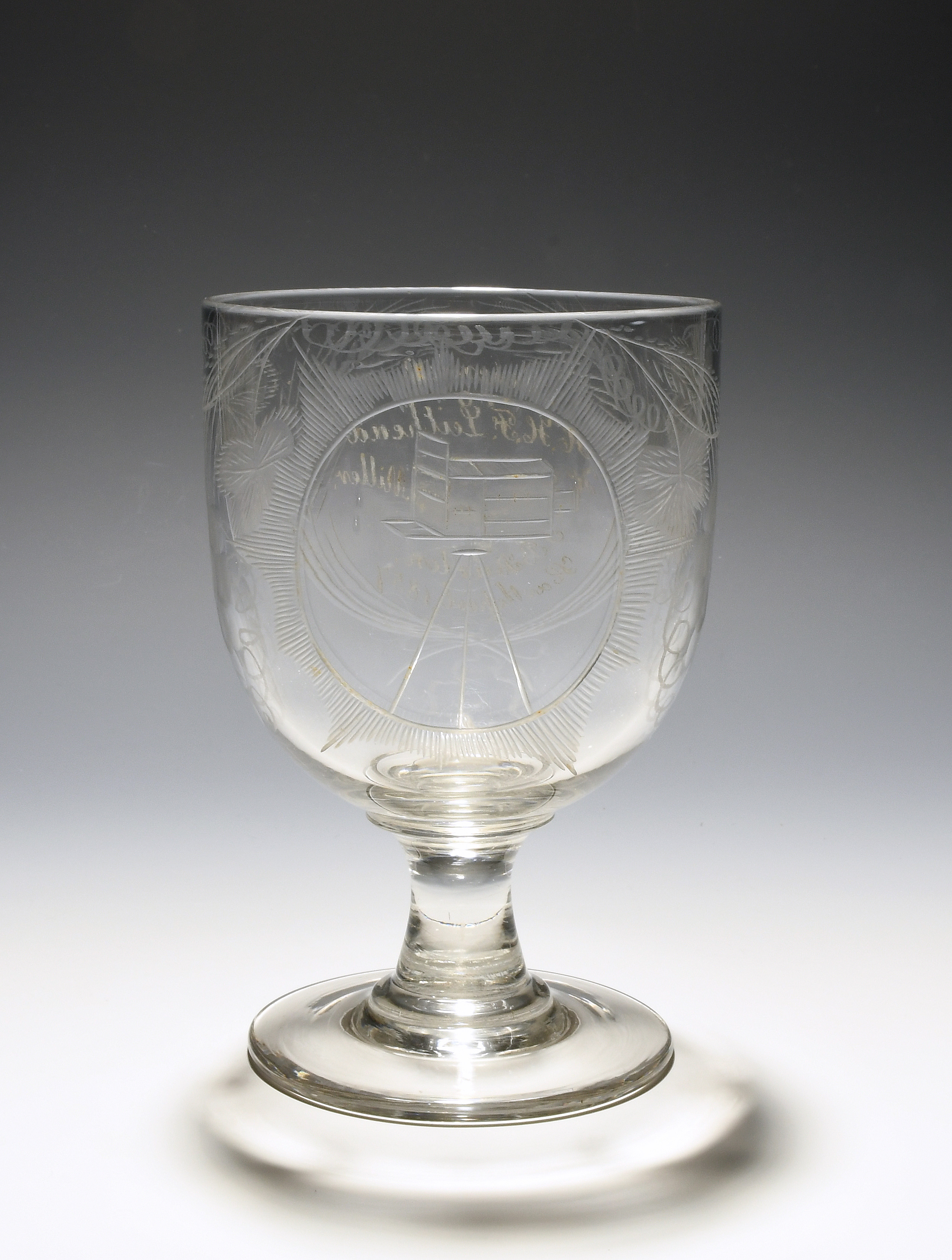 A large glass rummer of photographic interest, dated 1857, engraved with a panel containing a camera, inscribed 'Presented to H H F Leithead by H H Bright, R Miller & J B Burden, Hartlepool 1857', within fruiting grapevine, raised on a short plain stem, 17.2cm.