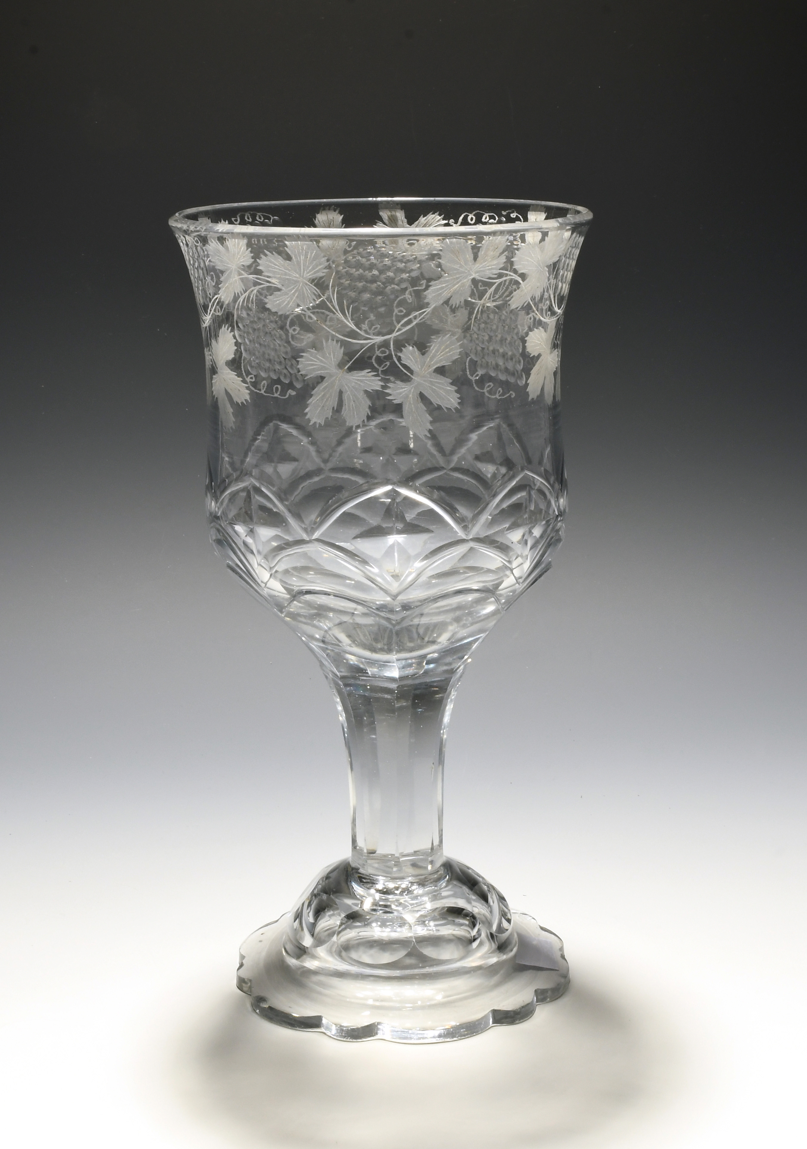 A large engraved glass goblet, c.1770-80, the slightly waisted bowl engraved with a continuous band of fruiting grapevine, the base of the bowl cut with lappets above a faceted stem and helmet foot with polished ovals, small footrim chips, 26.5cm.