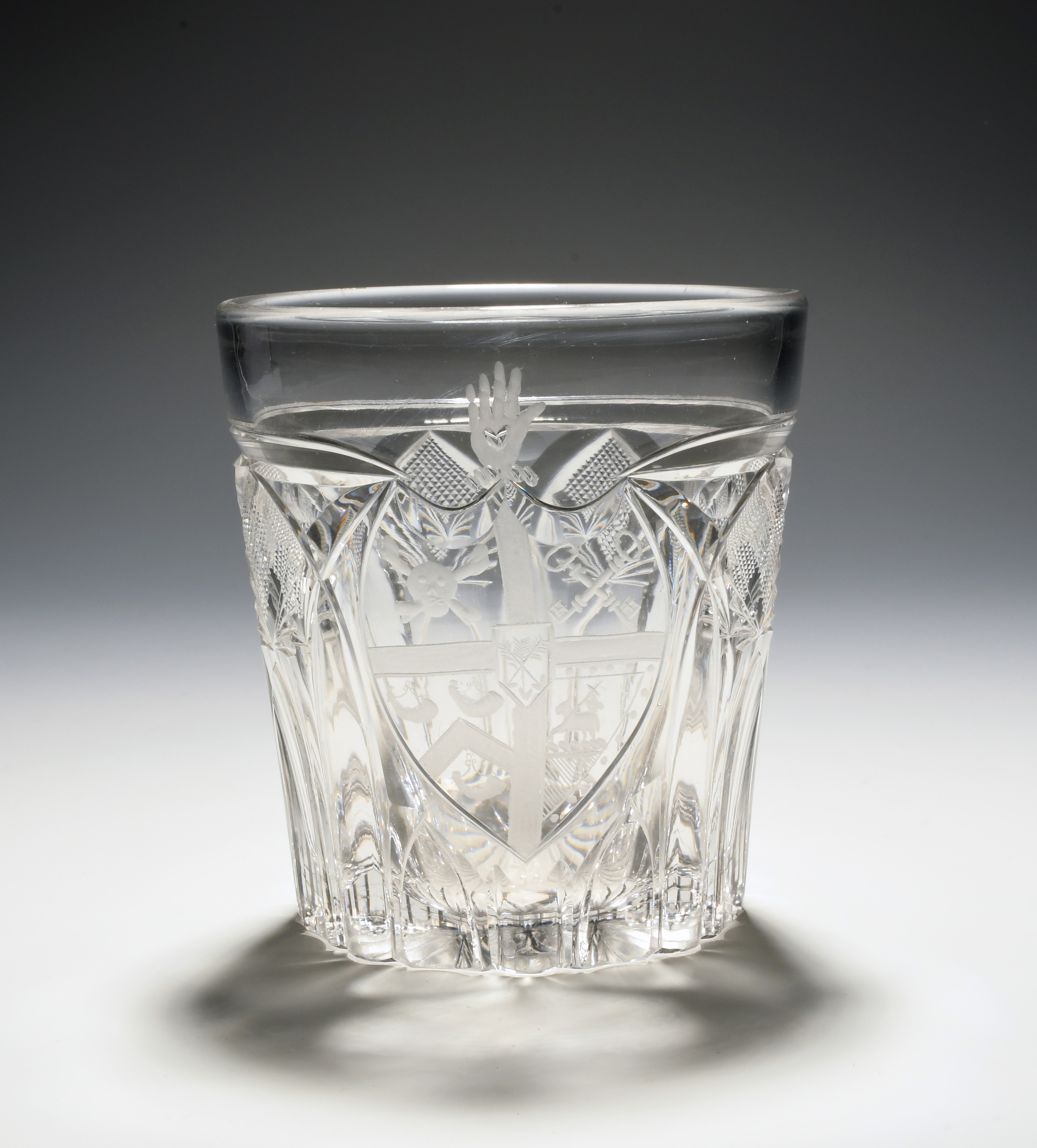 An armorial glass tumbler of Masonic significance, 19th century, engraved with a shield bearing a