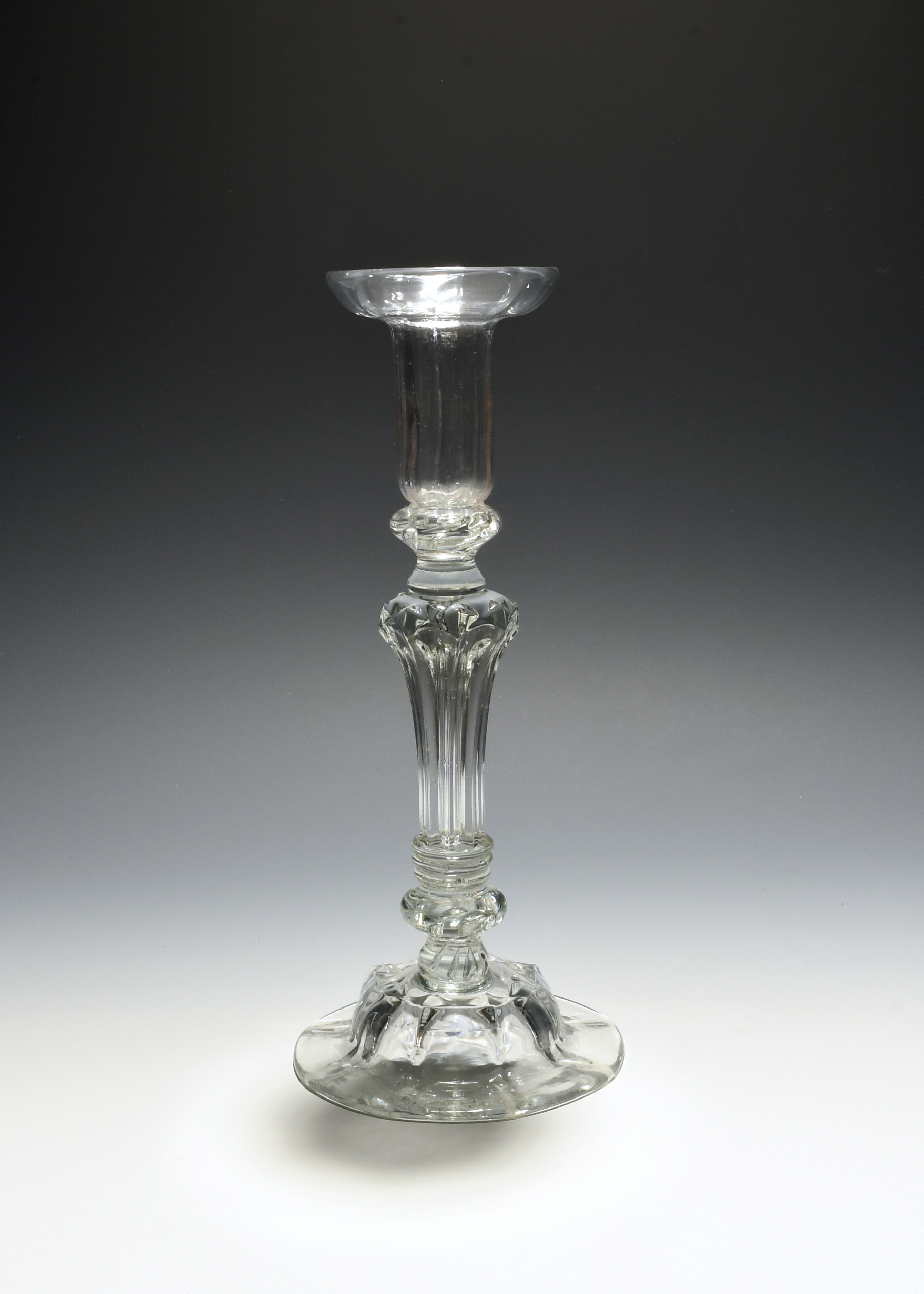 A tall pedestal glass candlestick, c.1720, the moulded sconce with everted rim, raised on a pedestal