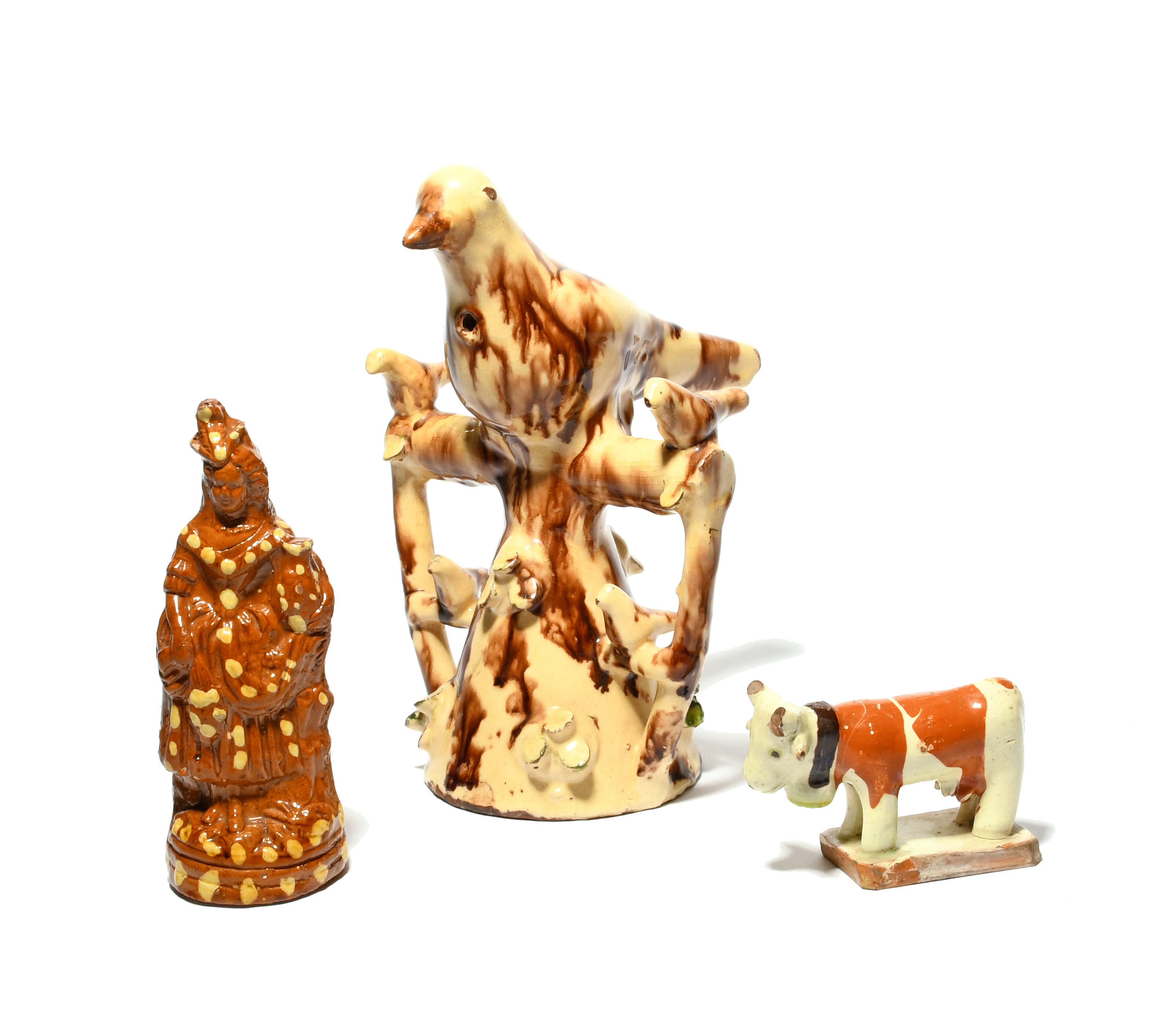 A large Halifax slipware bird whistle, c.1800-20, with a large central bird mounted on a perch flanked by smaller birds above a conical base, a small slipware model of a cow wearing a large bell around her neck, and a slipware figure of a woman, decorated with cream dots on a treacle ground, some damages, 24.5cm max. (3)