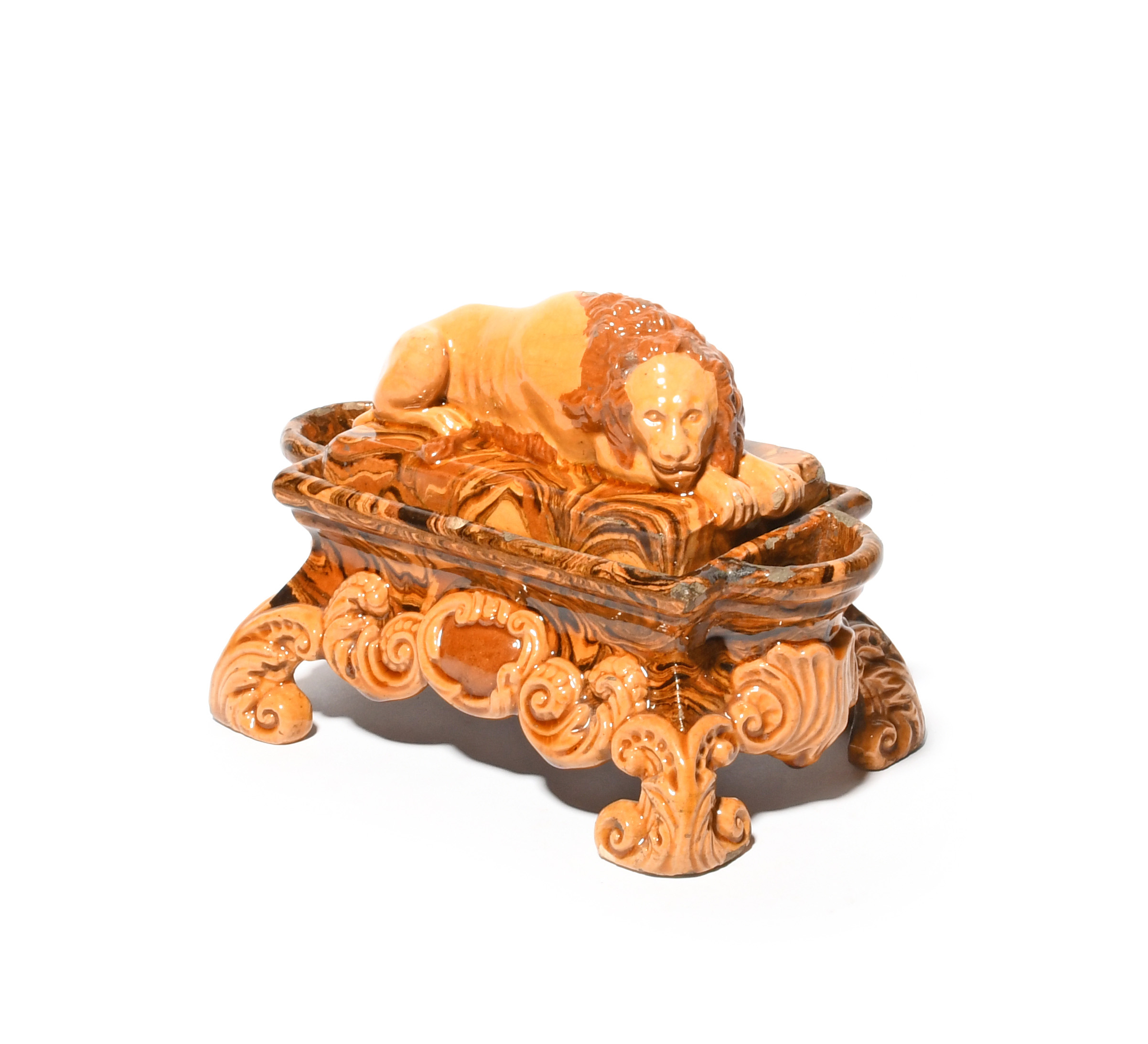 A slipware double inkwell, 19th century, the cover modelled with a recumbent lion, the rectangular base modelled from agateware and set with a small inkwell and a pounce pot, raised on scrolled feet, impressed 2 marks, some surface chipping, 16.5cm across. (4)
