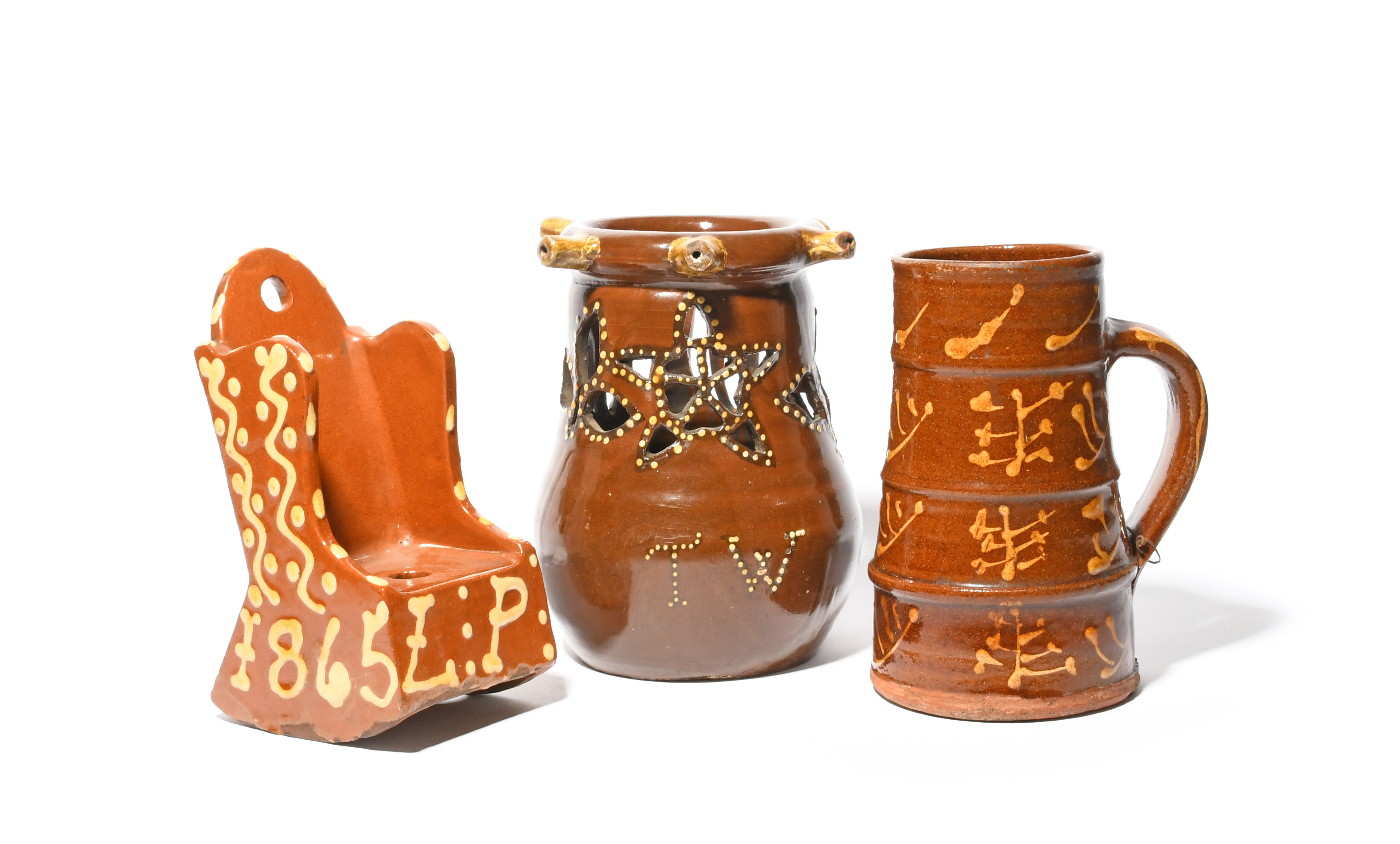 A Yorkshire slipware puzzle jug, probably 19th century, inscribed 'TW 1758' in cream slip, the neck pierced with tulips and an elaborate star, a Halifax slipware model of a rocking chair, inscribed 'LP' and dated 1865, and a slipware tankard with stylised motifs, minor faults, 20cm max. (3)