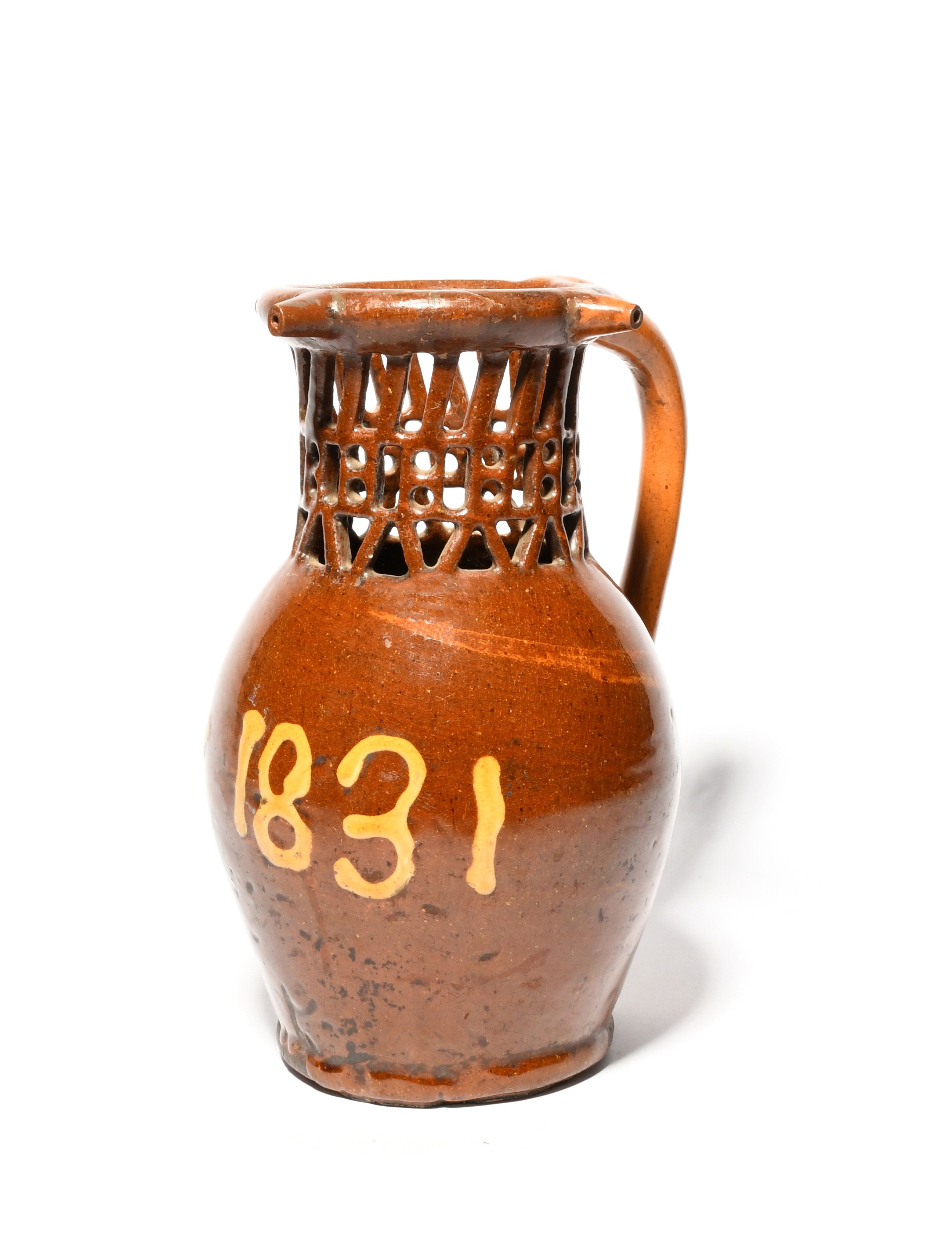 A large slipware puzzle jug, dated 1831, inscribed 'J + ny 1831' in cream slip on a rich treacle ground, the tall neck pierced with an elaborate design, the neck with three conical spouts, some restoration to the rim, 26cm.