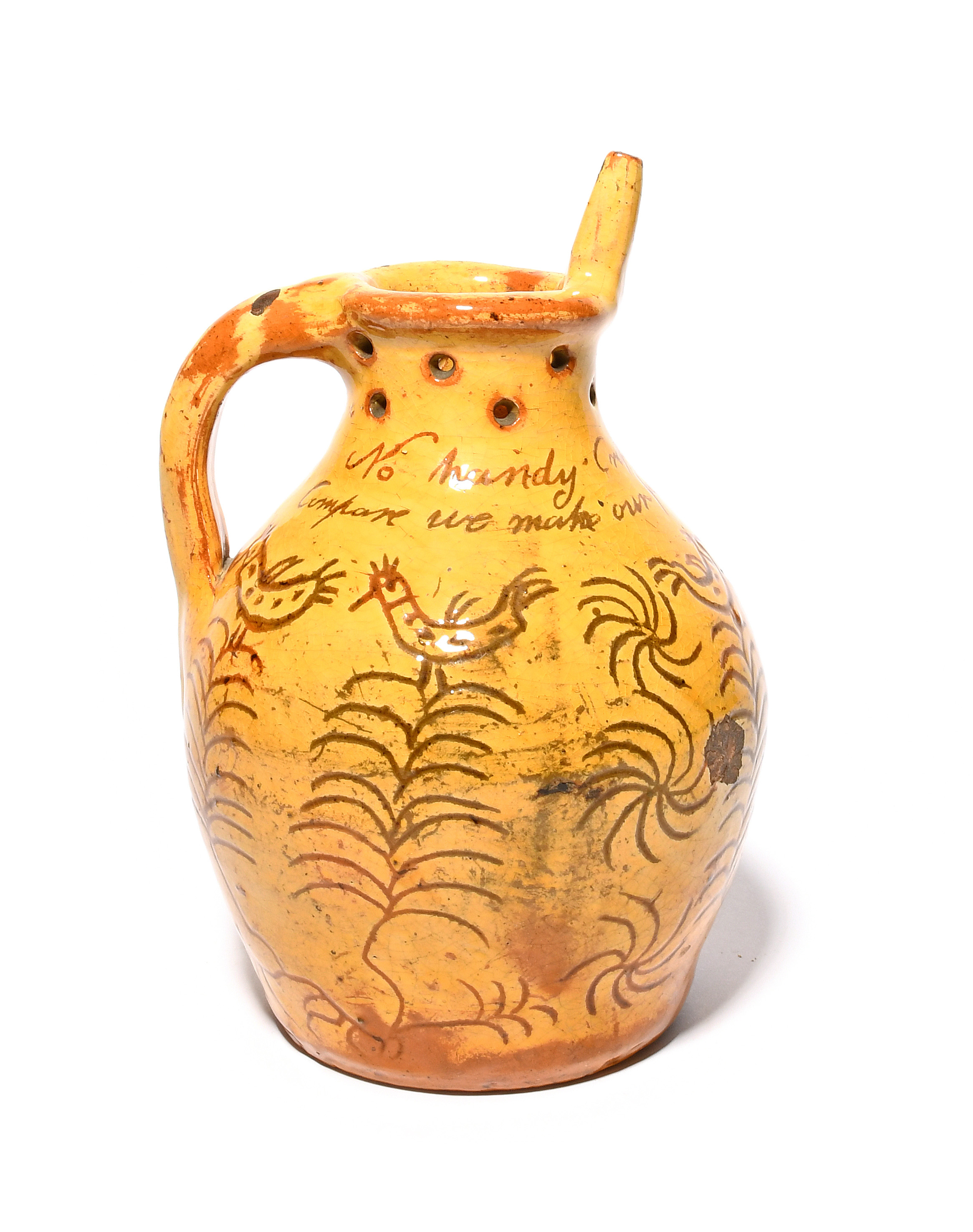 A good Donyatt slipware puzzle jug, dated 1829, with sgraffito decoration of birds perched atop leafy stems, around the shoulder inscribed 'No handy craft can with our art Compare we make our pots of what we potters are', the neck pierced, the rim with a single pointed spout, all in a rich yellow slip, 21.5cm.