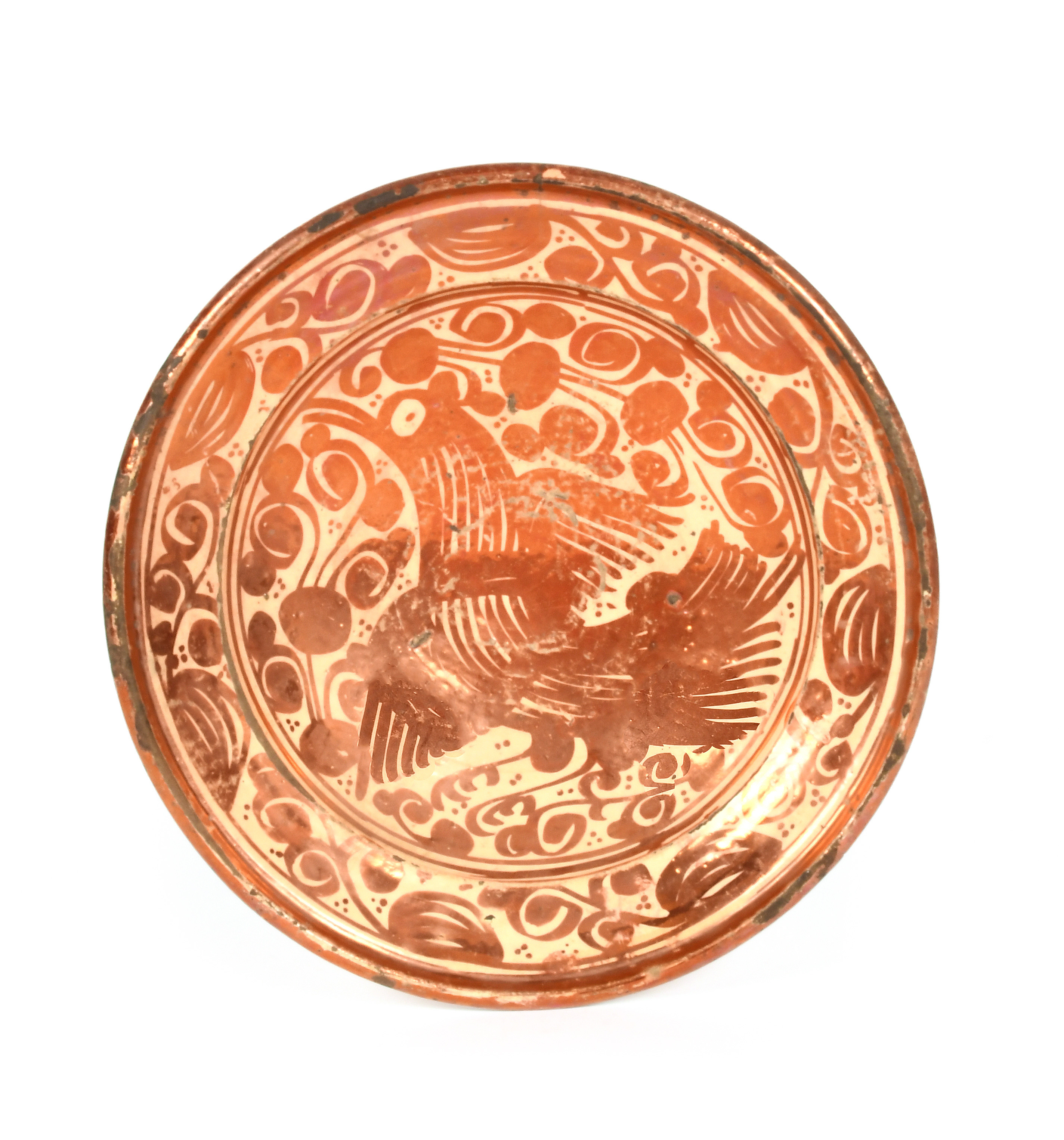 A Hispano Moresque lustre bowl or charger, late 17th/18th century, decorated in copper lustre with a large bird amidst stylised branches, the rim with a repeated foliate motif, three rim cracks, 36cm.