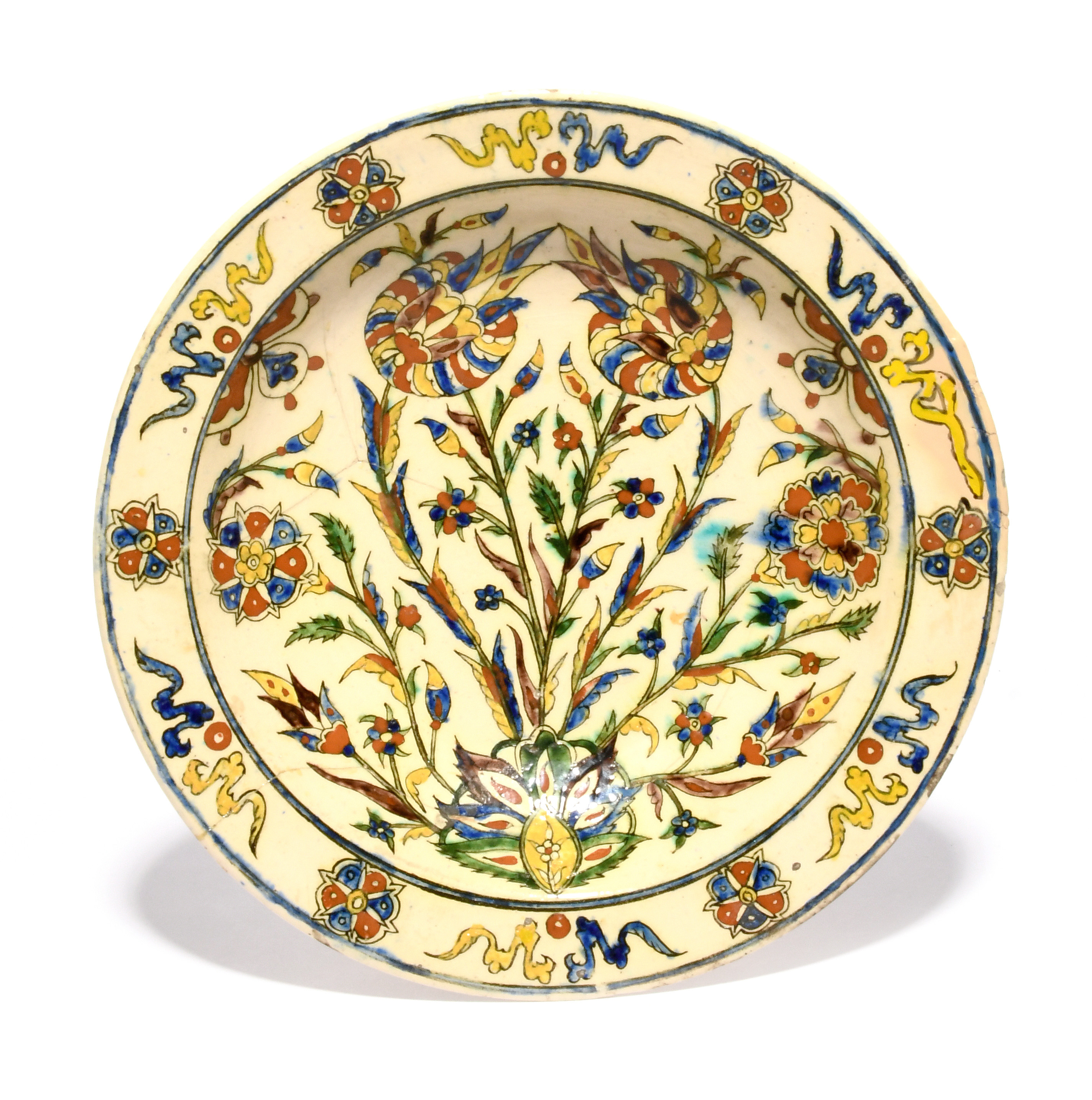 A Kutahya Iznik-style dish, late 18th/19th century, boldly painted with a formal arrangement of flowers and leaves in blue, green, manganese, yellow and terracotta red, some damages and repairs, 26.8cm.