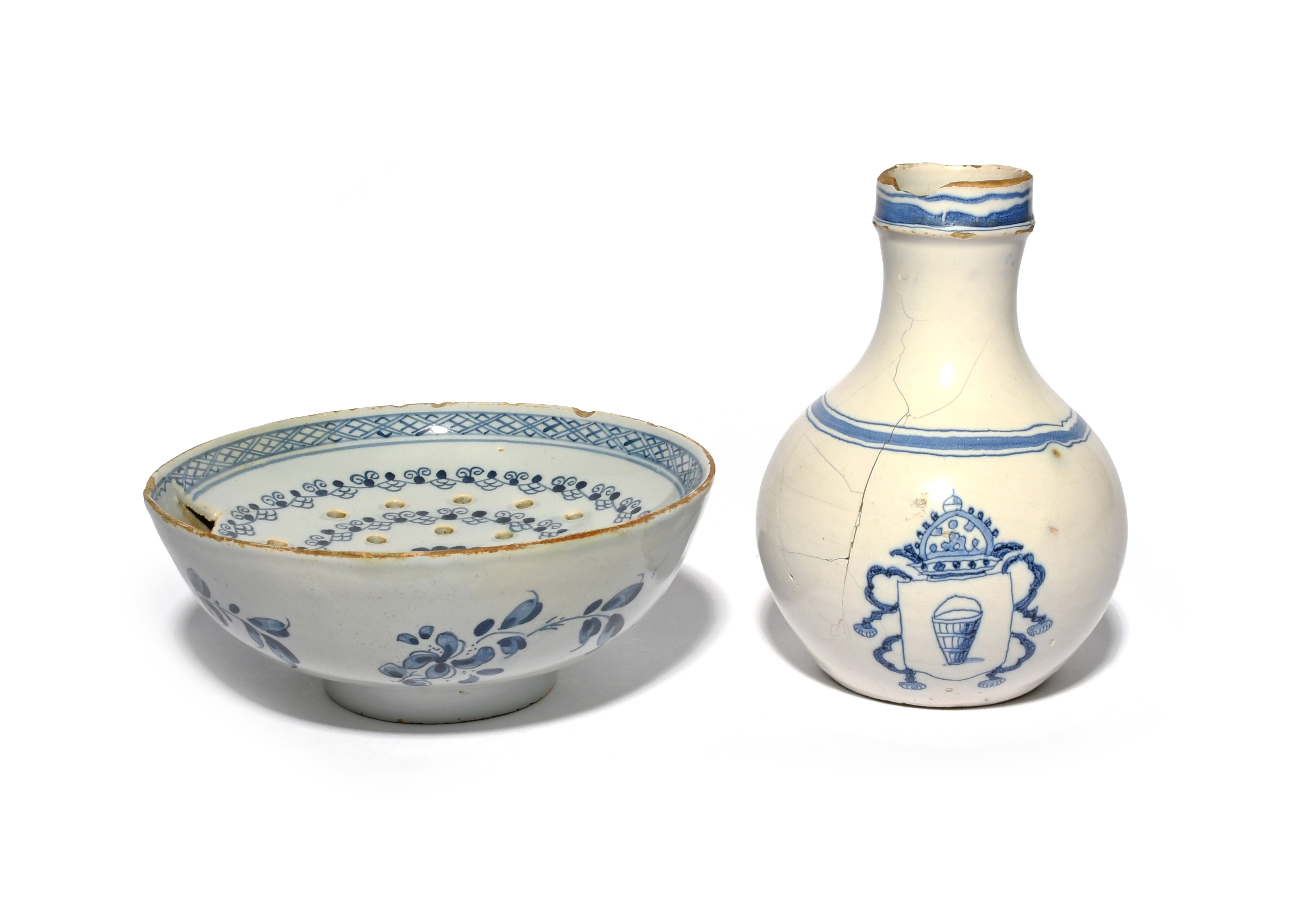 A Delft armorial jug, 1st half 18th century, painted in blue with a crowned shield containing a wooden bucket, and a delftware straining bowl, painted to the exterior with peony and other plants, the concave top pierced with holes, the jug cracked, restored rim chips to the bowl, 19.5cm max. (2)