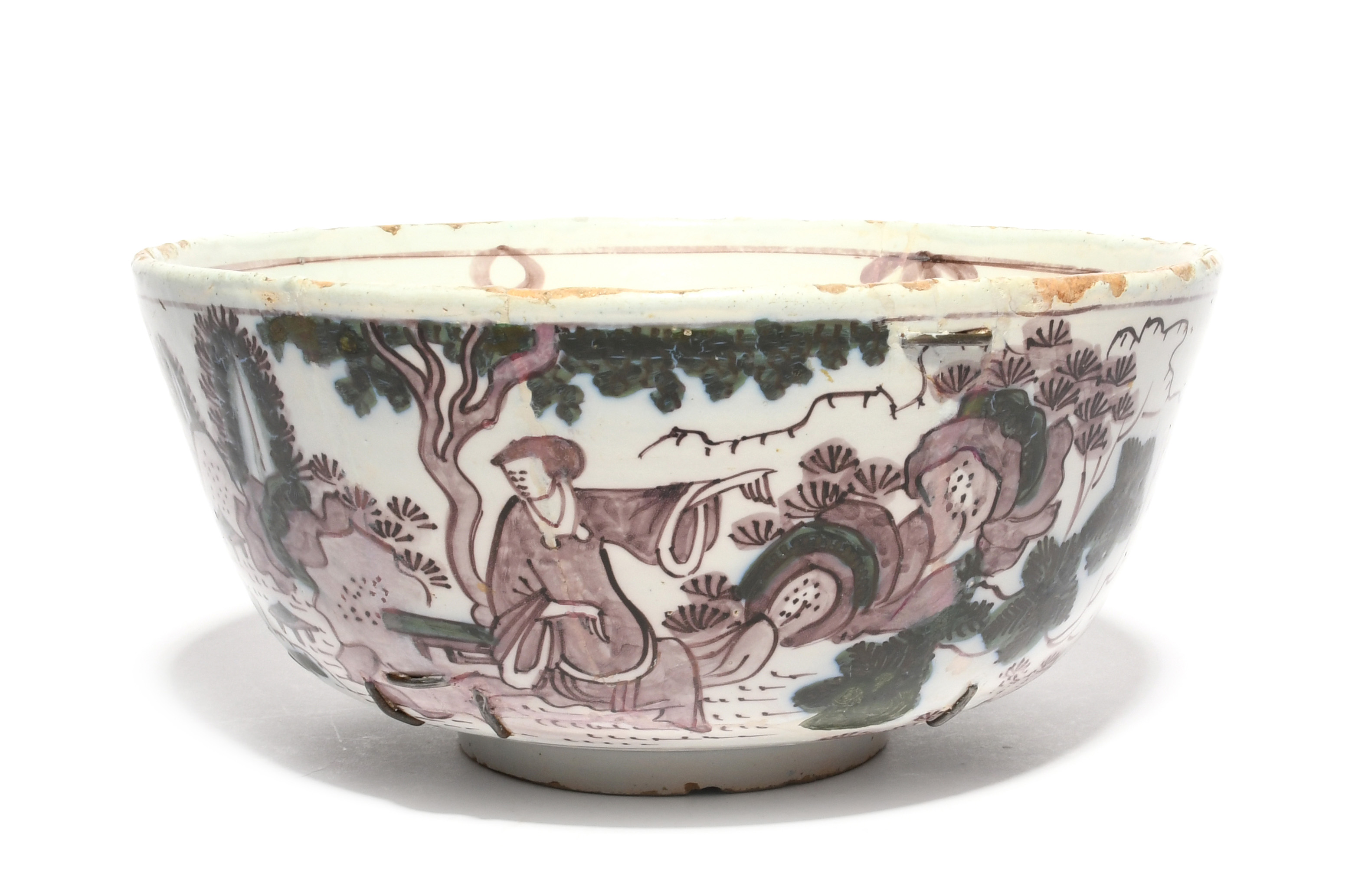 A Delft bowl, c.1690-1710, painted in manganese and green with Chinese figures in a continuous landscape, the interior with two stylized figures carrying long staffs, riveted, 21.5cm dia.