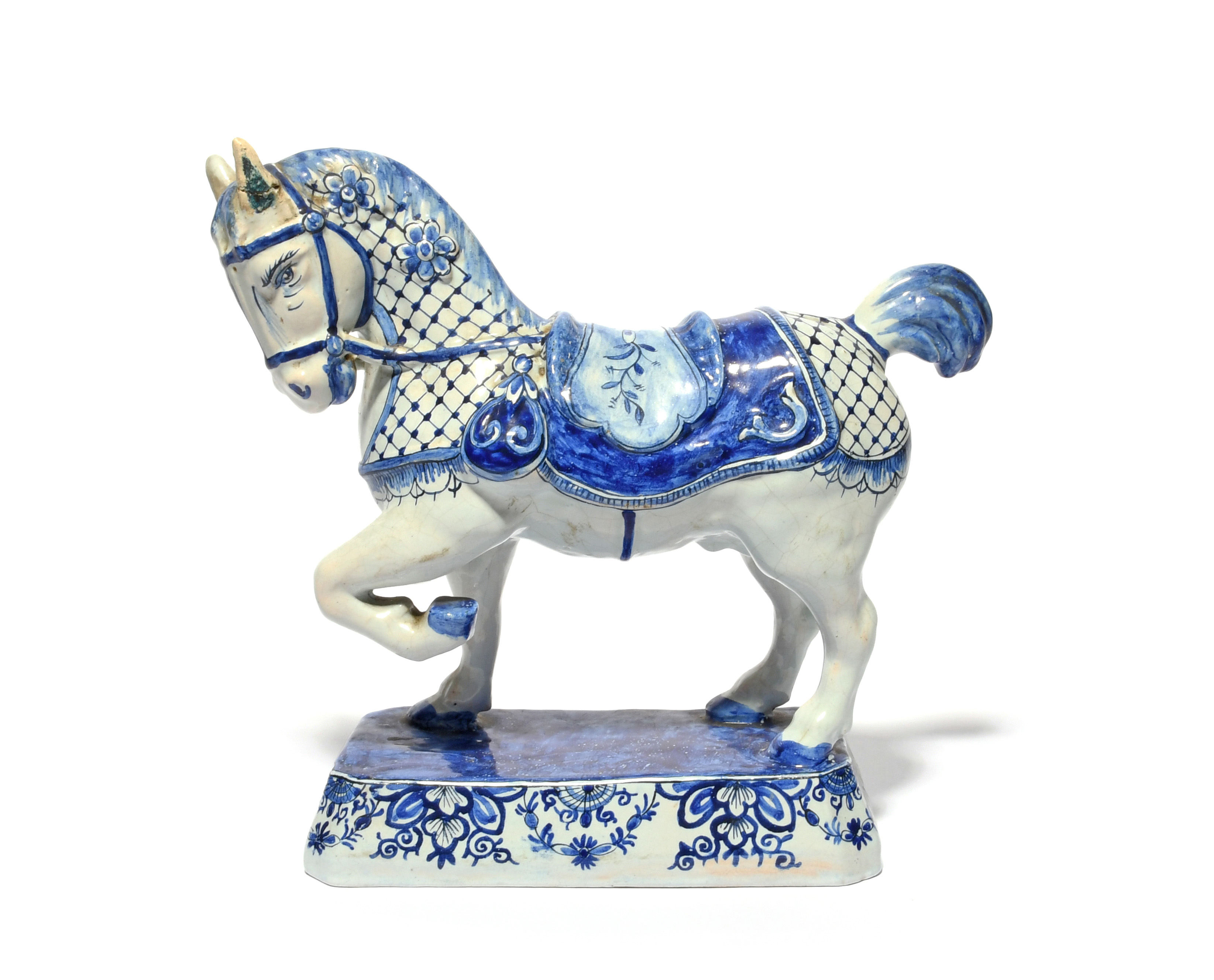 A Delft figure of a horse, late 18th century, modelled with ears pricked and left fore hoof raised, wearing a patterned saddle and decorated in blue enamel, raised on a chamfered rectangular base, letters mark for Jacobus Halder, repairs to the ears, 21cm.