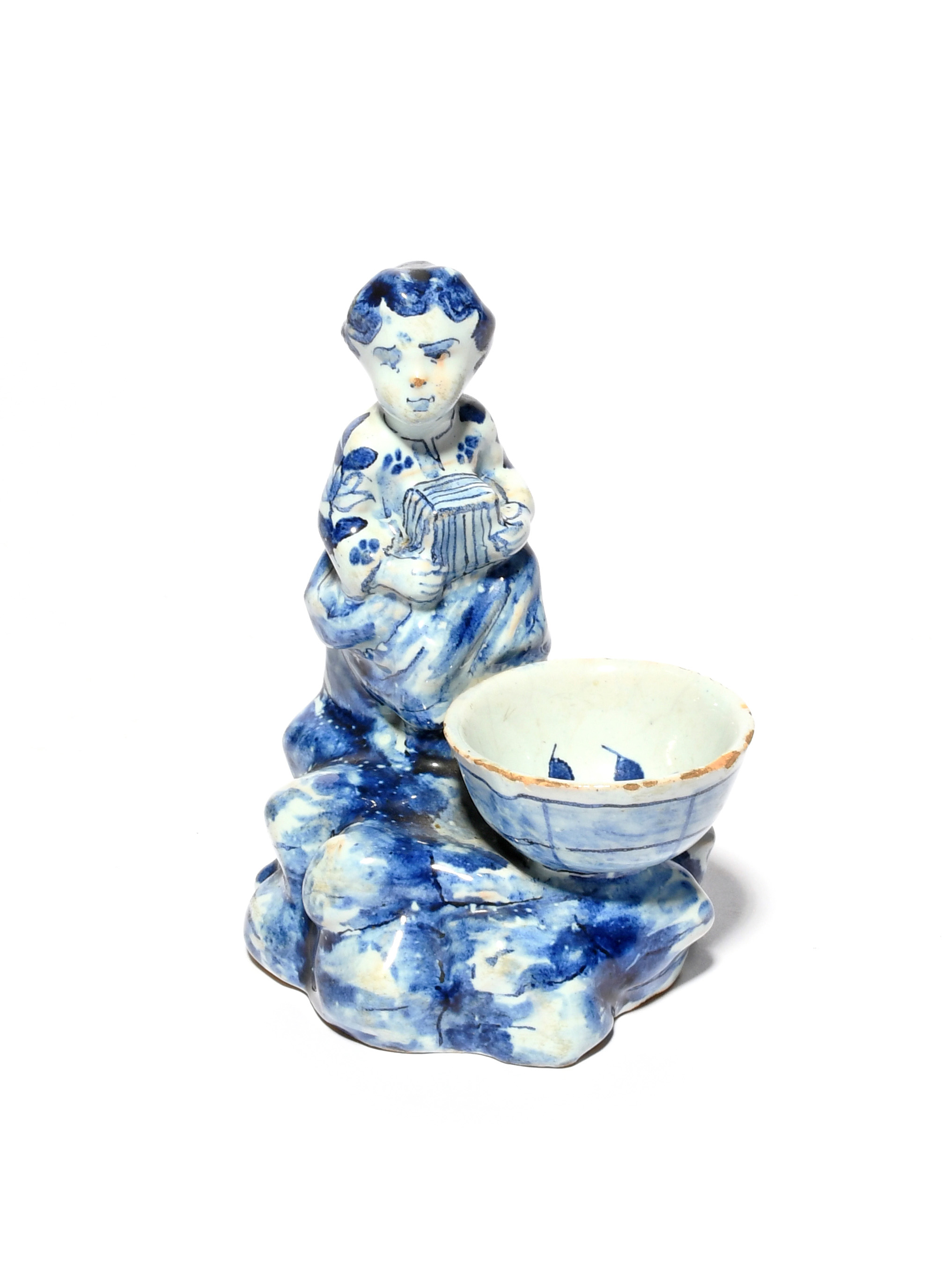A small Delft figural salt, 18th century, modelled as a girl seated and holding a box or instrument, before a small bowl, all raised on a rocky base, blue AL monogram mark, 10.5cm.