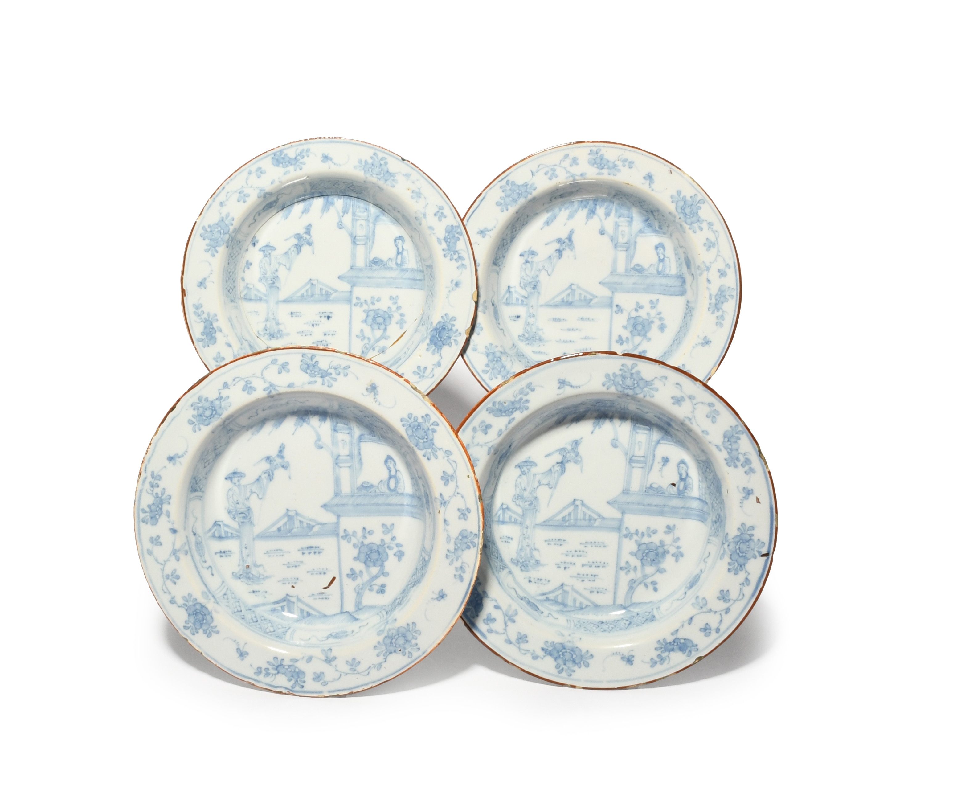 Four small Liverpool delftware bowls, c.1770, painted in pale blue with a Chinese figure standing in a window and watching another figure holding a bird aloft, the rims with floral motifs, some faults, 21cm. (4)