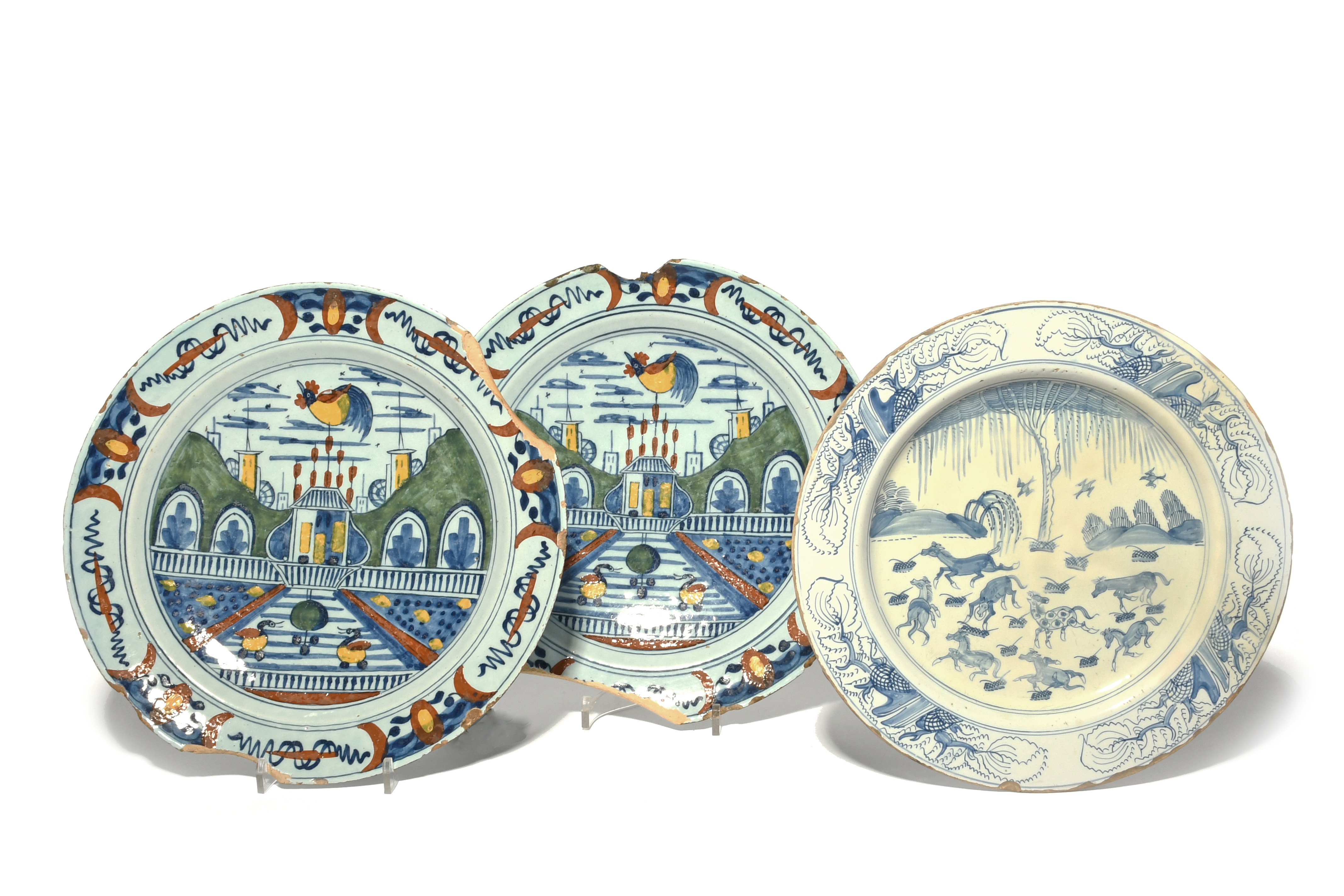 A rare pair of Delft plates, early 18th century, boldly painted in blue, red, green and yellow with a formal Dutch garden landscape showing a narrow canal before spired buildings and a prominent cockerel weather vane, with a rare Liverpool delftware plate painted in blue with the Eight Horses of Mu Wang after a Chinese original, damages and restoration, 29.5cm max. (3)