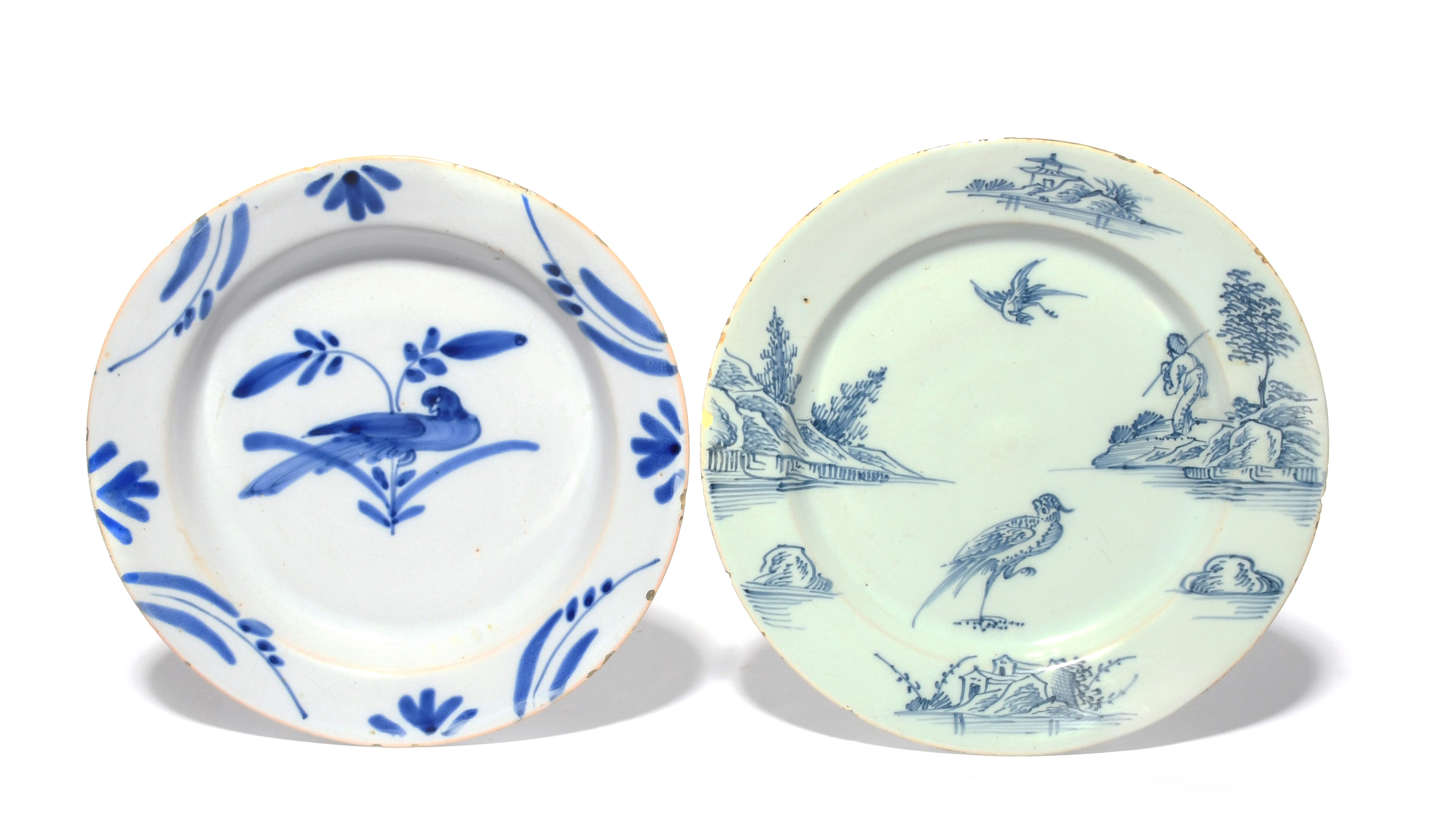 Two delftware plates, c.1730-60, one of primitive shape and painted in blue with a long-tailed bird