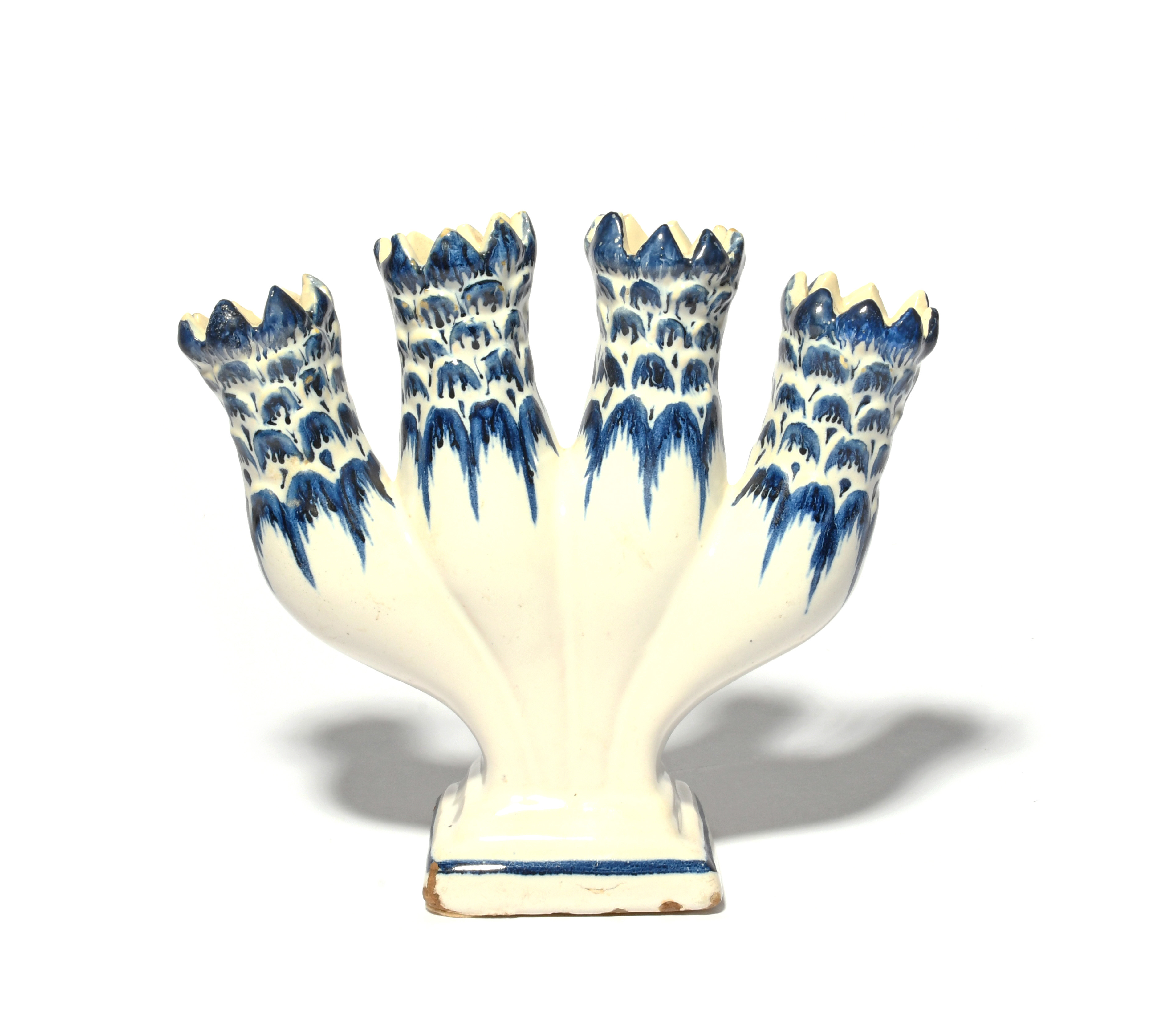 A Delft tulipiere or flower vase, late 18th century, formed of four apertures moulded with