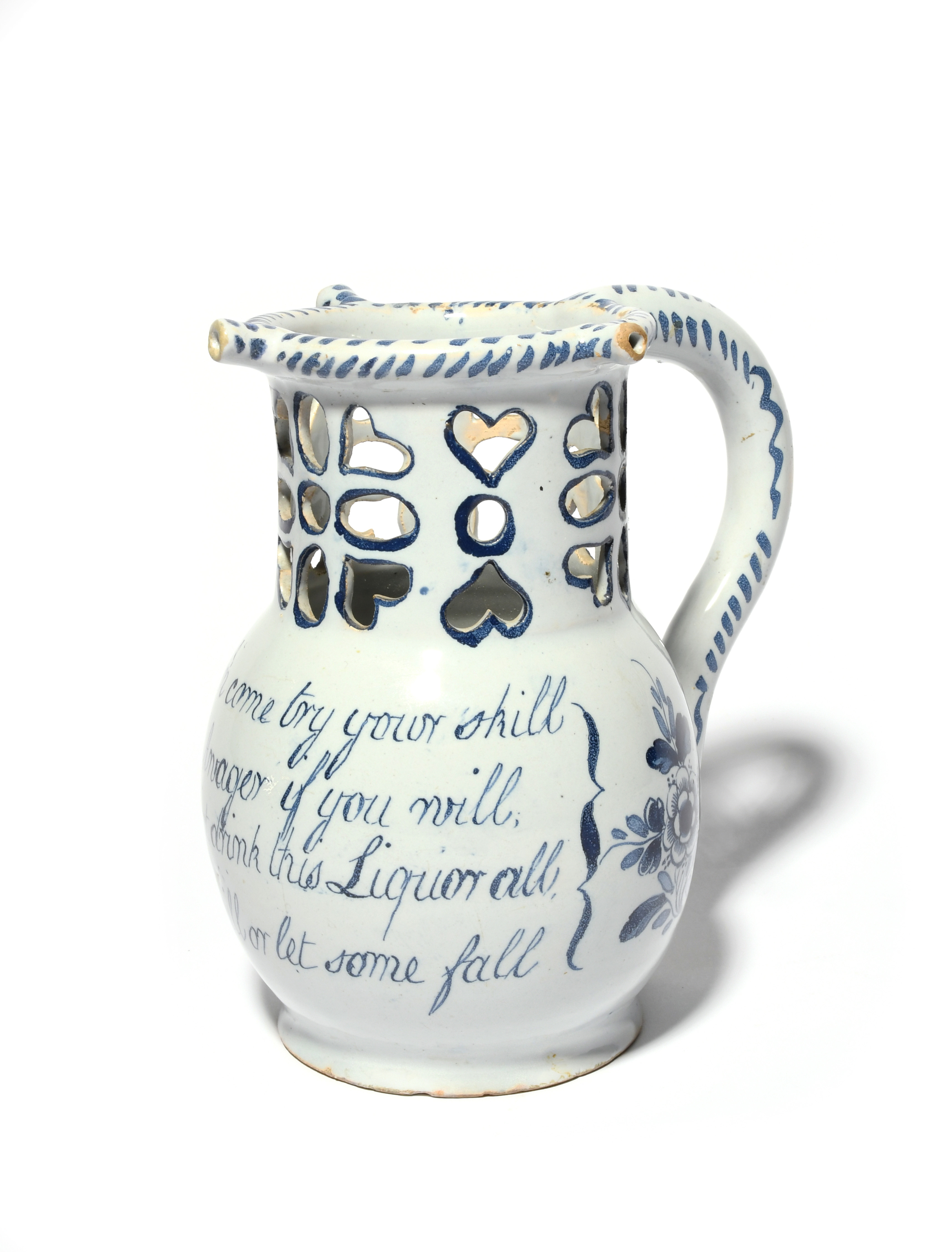 A delftware puzzle jug, c.1760, probably Liverpool, painted with flower sprays flanking a four line verse inviting drinkers to try their luck, the tall neck pierced with hearts and ovals, the rim with three small spouts, some good restoration to one spout, some glaze chipping, 18.5cm high.