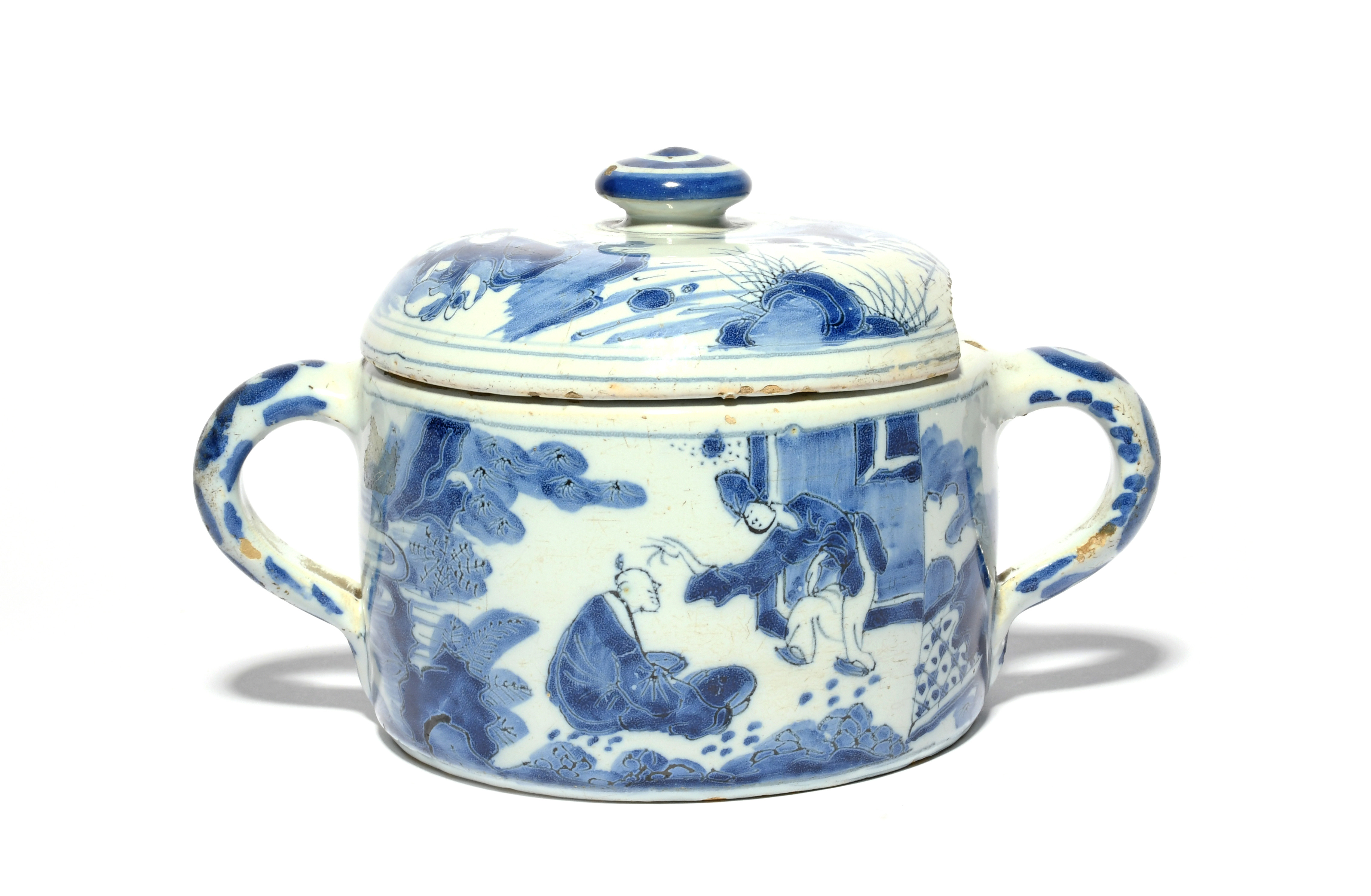 A delftware posset pot and cover, c.1700, painted in blue with Chinese figures at various pursuits in a garden setting, a large chip to the cover and to the flange of the pot, 21.5cm across. (2)