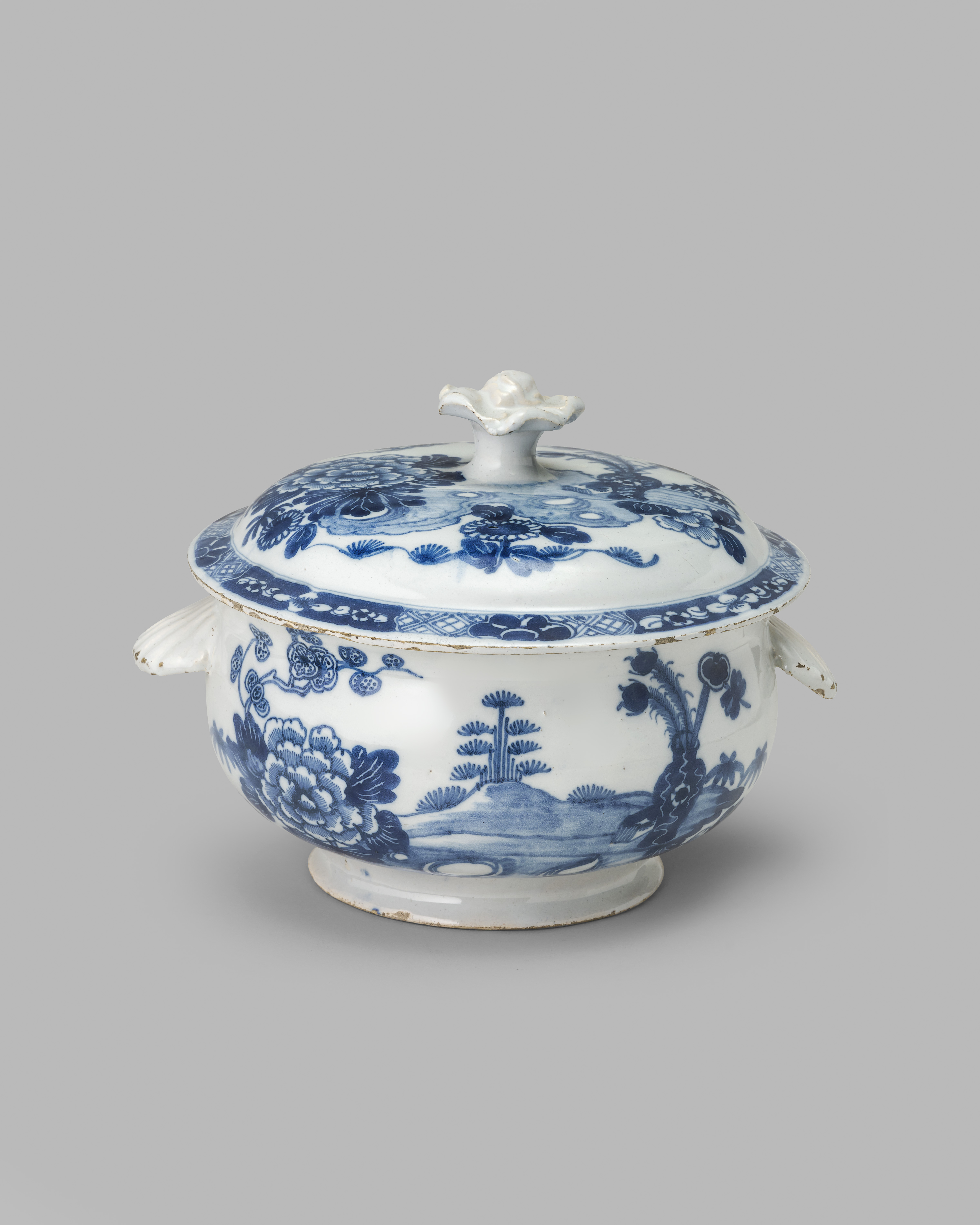 A rare and previously unrecorded Irish delftware tureen and cover, c.1760, the circular form with