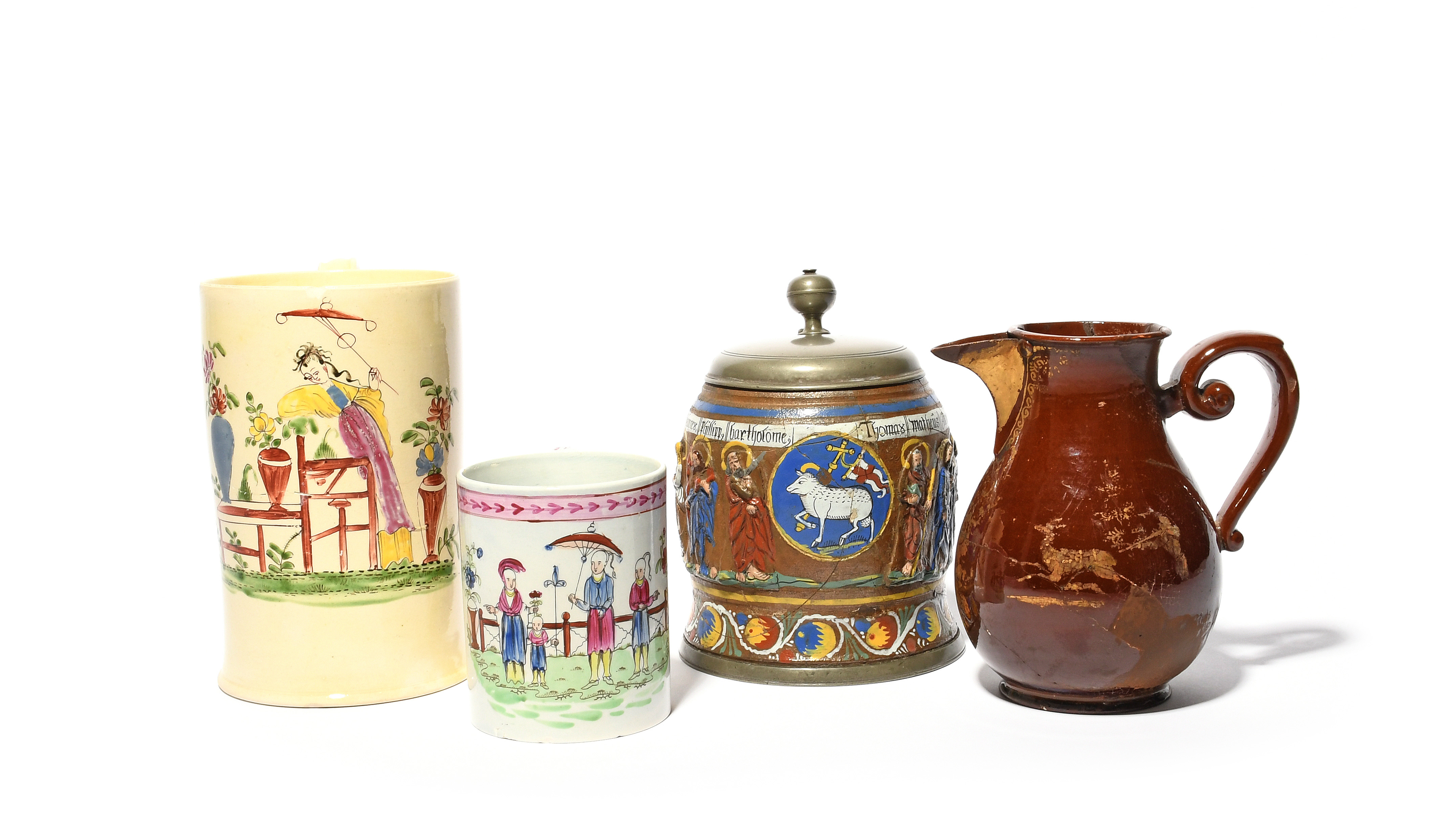 A Creussen stoneware pewter-mounted tankard (Apostelkrug), late 17th century, moulded in relief and enamelled with the twelve Apostles flanking the pascal lamb, with an 18th century German red-glazed hot water jug with gilded decoration, a tall English creamware mug painted in polychrome enamels with a Long Eliza holding a parasol, and a pearlware mug printed and hand-coloured with Chinese figures in a garden, damages, 15.8cm max. (4)