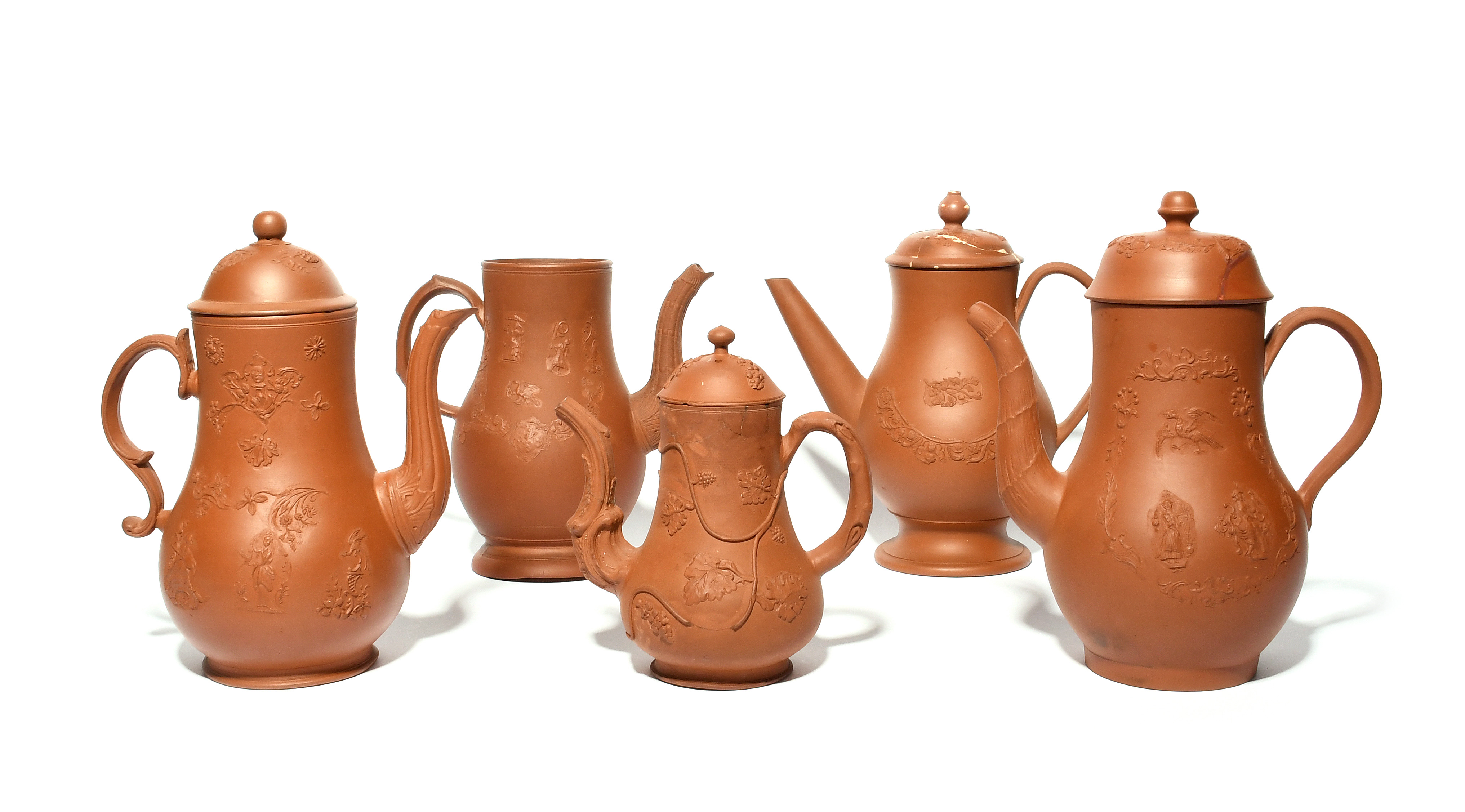 Five English redware coffee pots, c.1760-70, four with covers, of baluster form, the smallest sprigged with grapevine, three variously applied with birds in flight and Chinese figures, the last with formal foliate designs, some damages and repairs, 23cm max. (9)