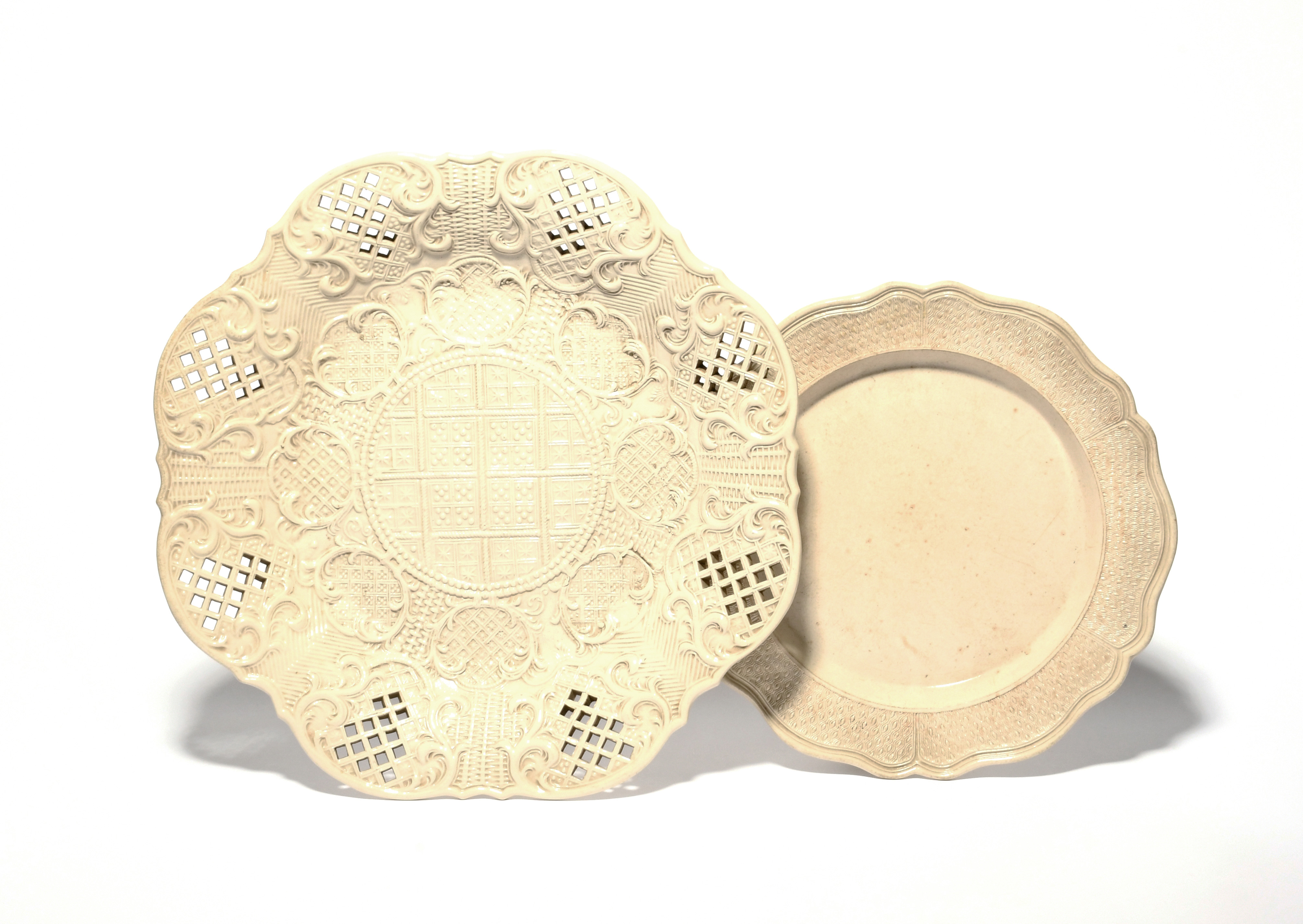 A large salt-glazed stoneware dish, c.1750, crisply moulded with alternating diaper panels within a reticulated rim, and a salt-glazed stoneware plate with silver-shaped rim, 31cm max. (2)
