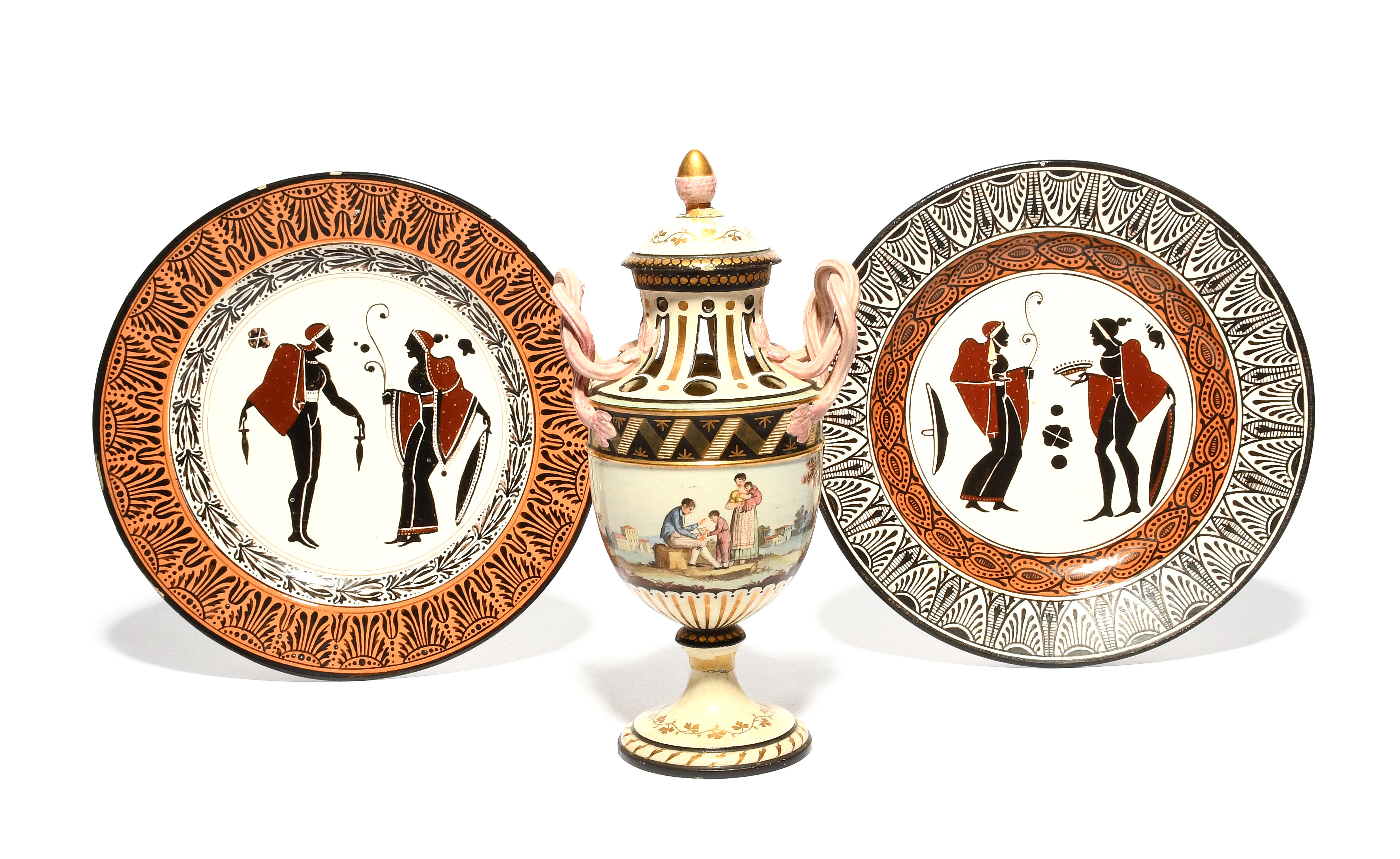 Two Naples (Guistiniani) creamware plates, 19th century, decorated in the Egyptian Revival manner with figures in black and terracotta within formal leaf borders, incised marks, and a Giacomo Boselli creamware vase and cover, painted with figures in a continuous landscape, the neck and shoulder pierced, some damages and repairs, 25.3cm max. (4)