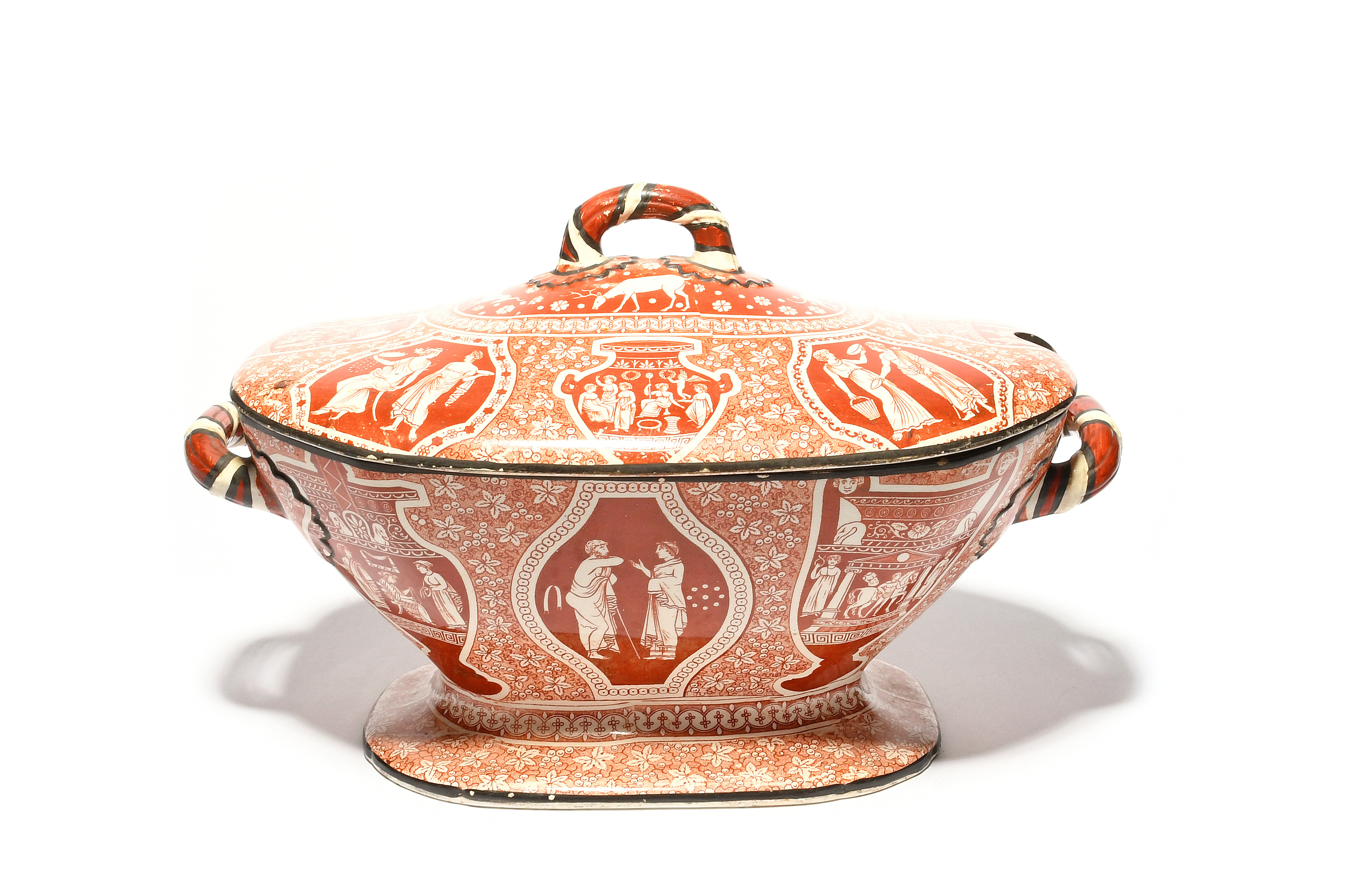 A Herculaneum creamware tureen and cover, 19th century, printed in red with Etruscan figures and