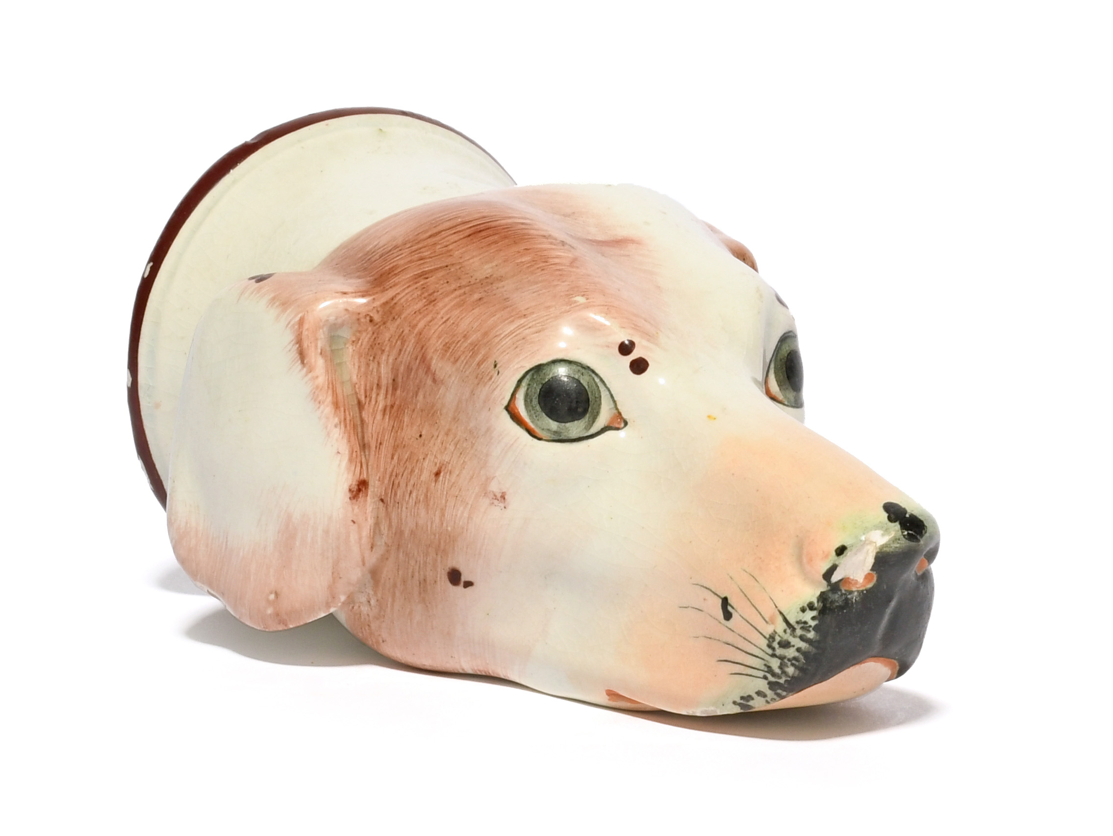 A pearlware stirrup cup, early 19th century, modelled as the head of a dog or hound, its coat