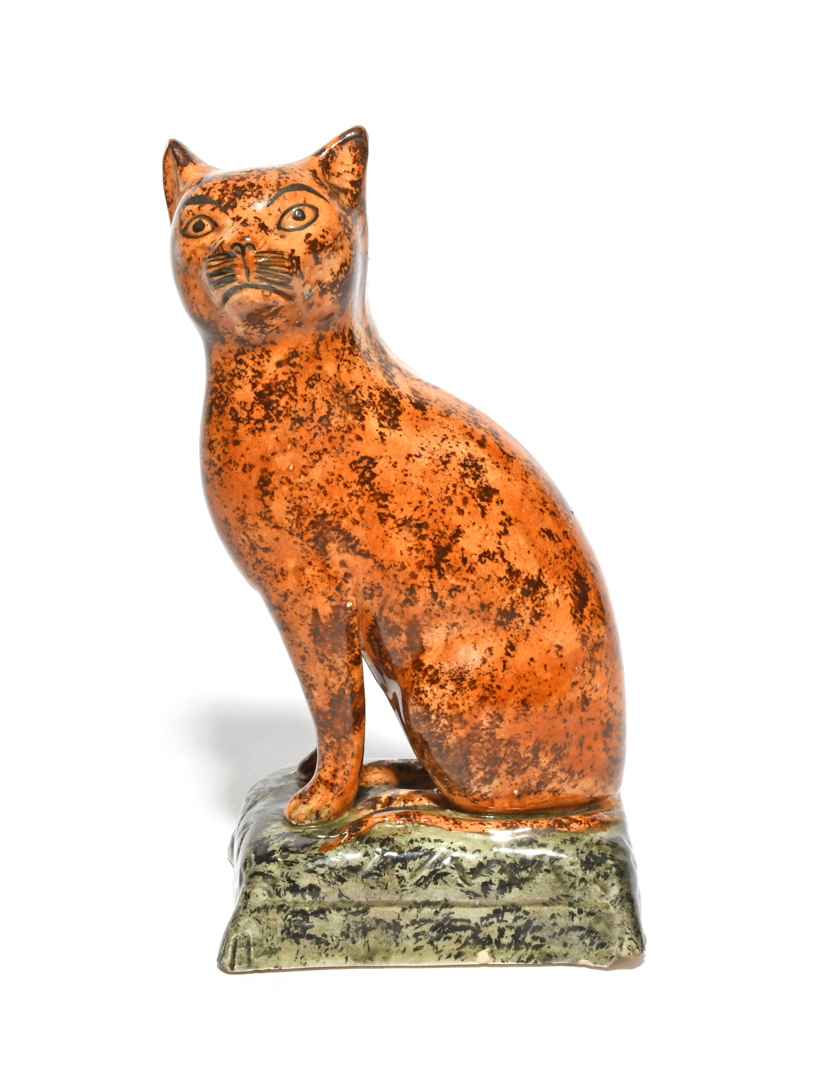 A rare pearlware figure of a cat, early 19th century, seated on its haunches with head turned to the left, its coat sponged with manganese over an orange glaze, raised on a grey patterned cushion, a chip to the base, 17.2cm.