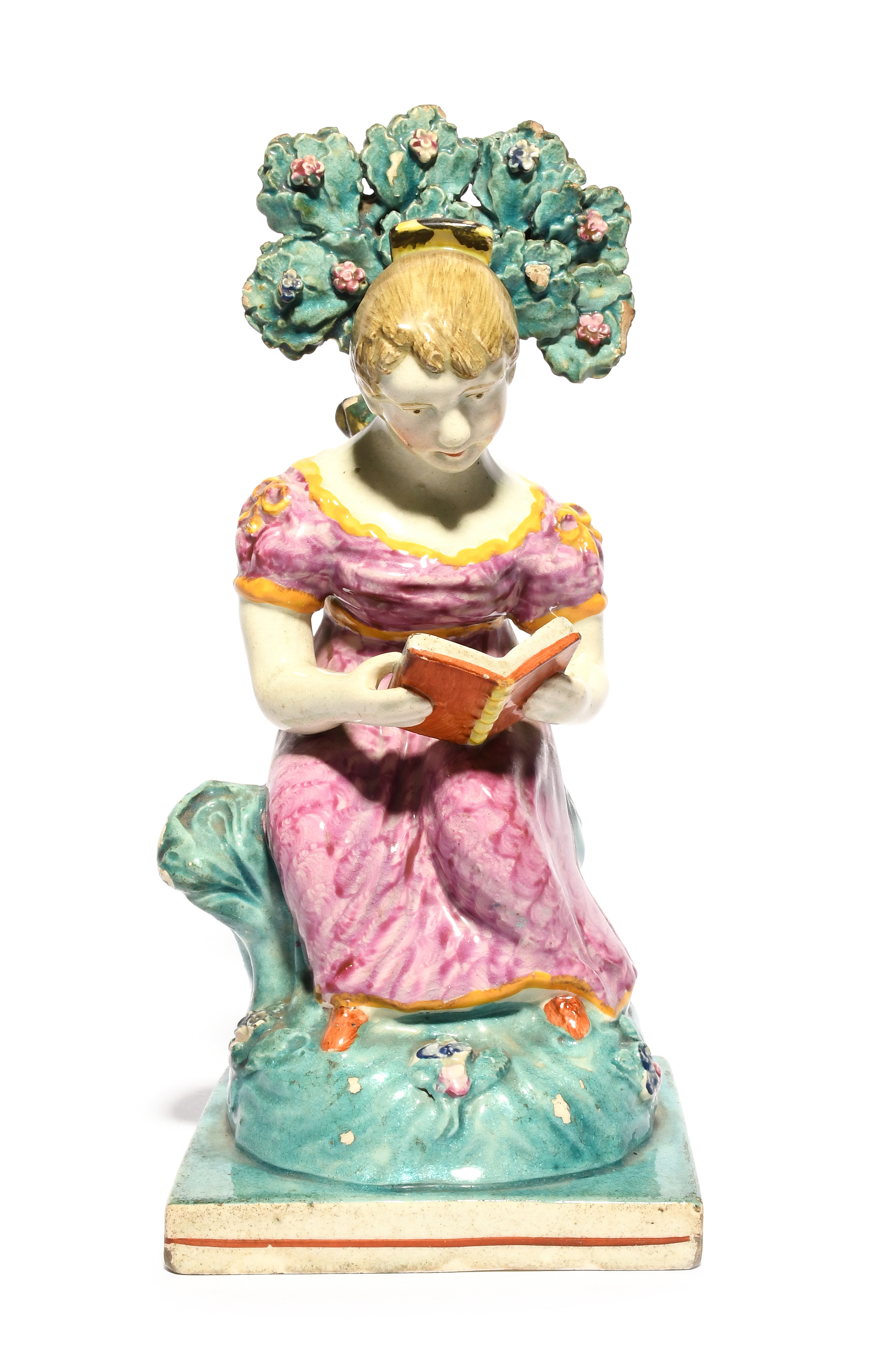 A Staffordshire figure of a girl, 1st half 19th century, seated on a rocky stump beneath flowering bocage and reading a book, raised on a square base, 26.3cm.