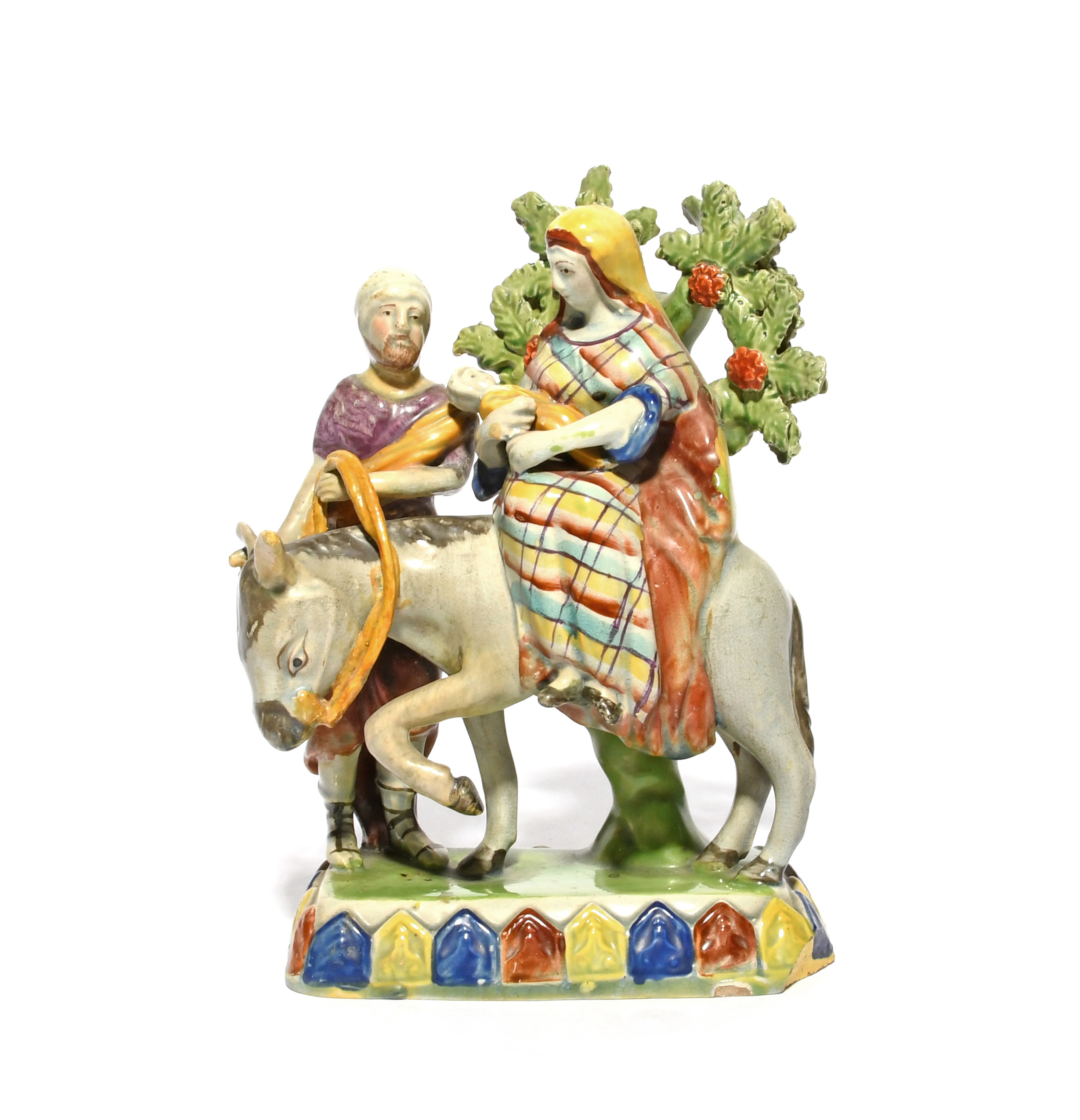 A Staffordshire figure group of the Flight to Egypt, early 19th century, modelled with Mary and the infant Jesus on the back of a donkey guided by Joseph, raised on an unusual shield base picked out in red, blue and yellow, some restoration, 19cm.